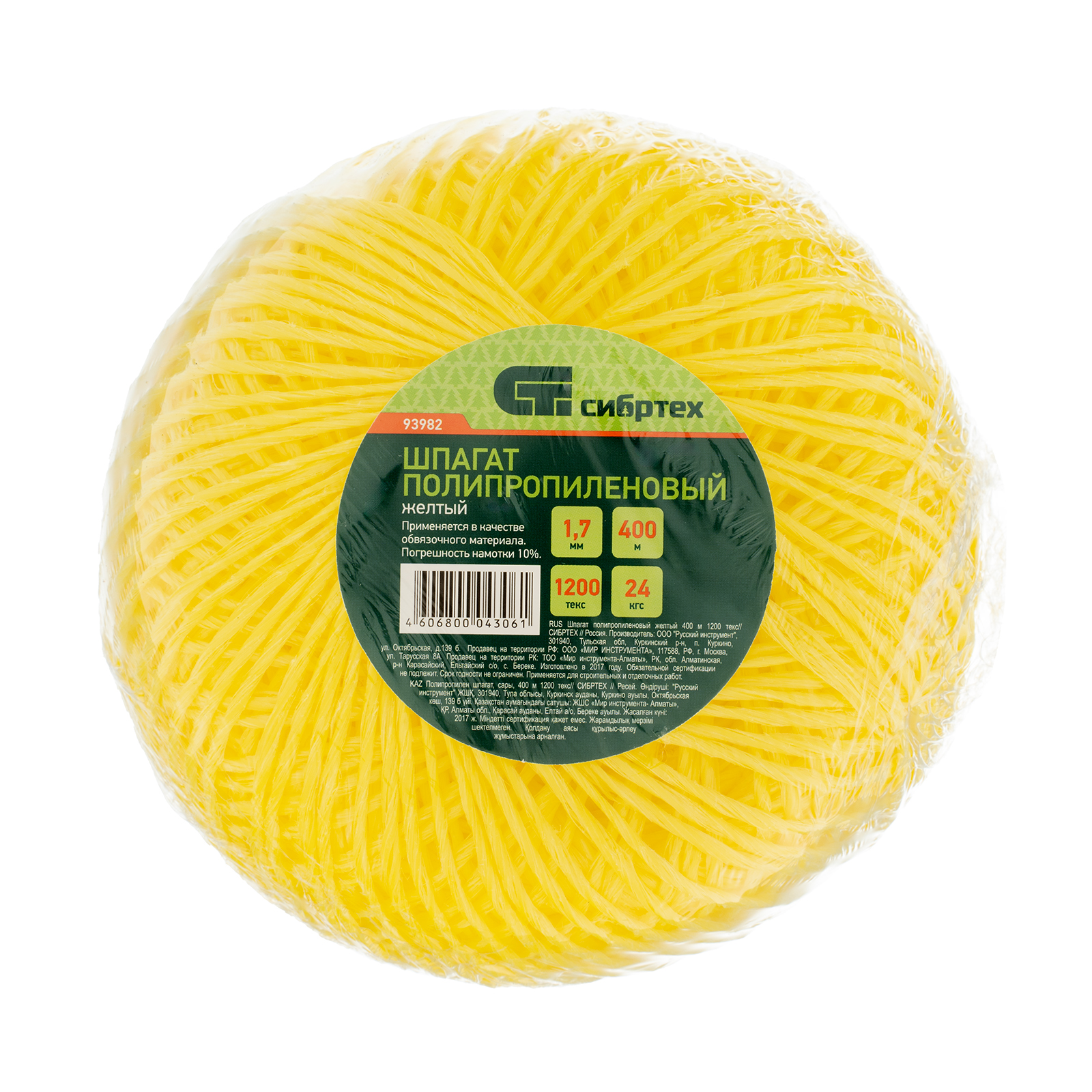 Шпагат полипропиленовый желтый, 1.7 мм, L400 м, Сибртех в Казани