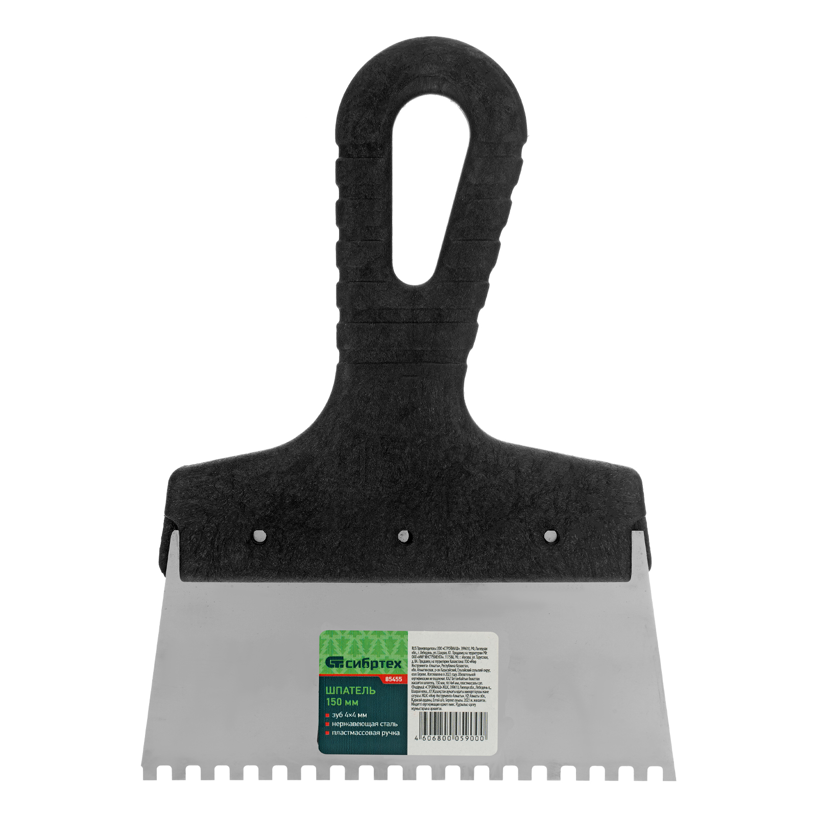 Шпатель из нержавеющей стали, 150 мм, зуб 4 х 4 мм, пластмассовая ручка Сибртех