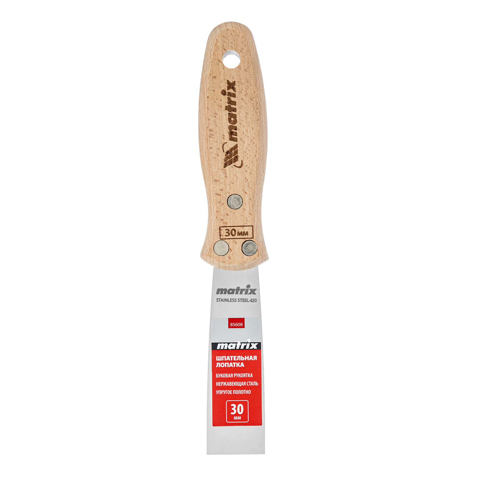 Шпательная лопатка Matrix 85608 с полотном из нержавеющей стали шириной 30 мм и буковой рукояткой предназначена для работы со строительными растворами. Применяется для нанесения различных смесей на поверхности, шпатлевания трещин и неровностей.