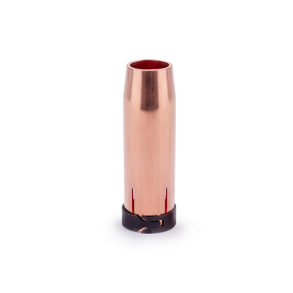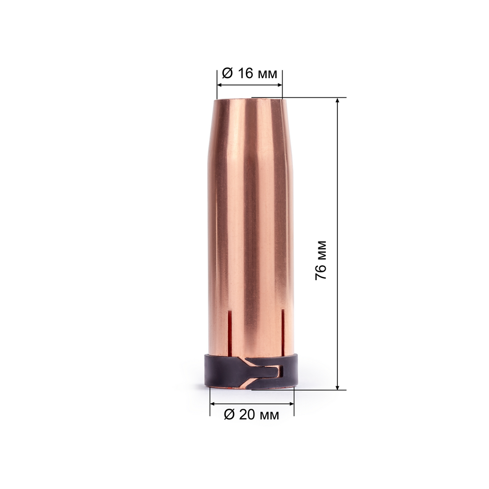 Использование конического сопла диаметром 16 мм позволяет создавать плотный поток защитного газа и направлять его к ванне расплавленного металла, таким образом защищая ее от вредного воздействия окружающей среды. Коническое сопло является неотъемлемой частью горелки для полуавтоматической сварки, надежно присоединяется к гусаку сварочной горелки посредством специального зажима.