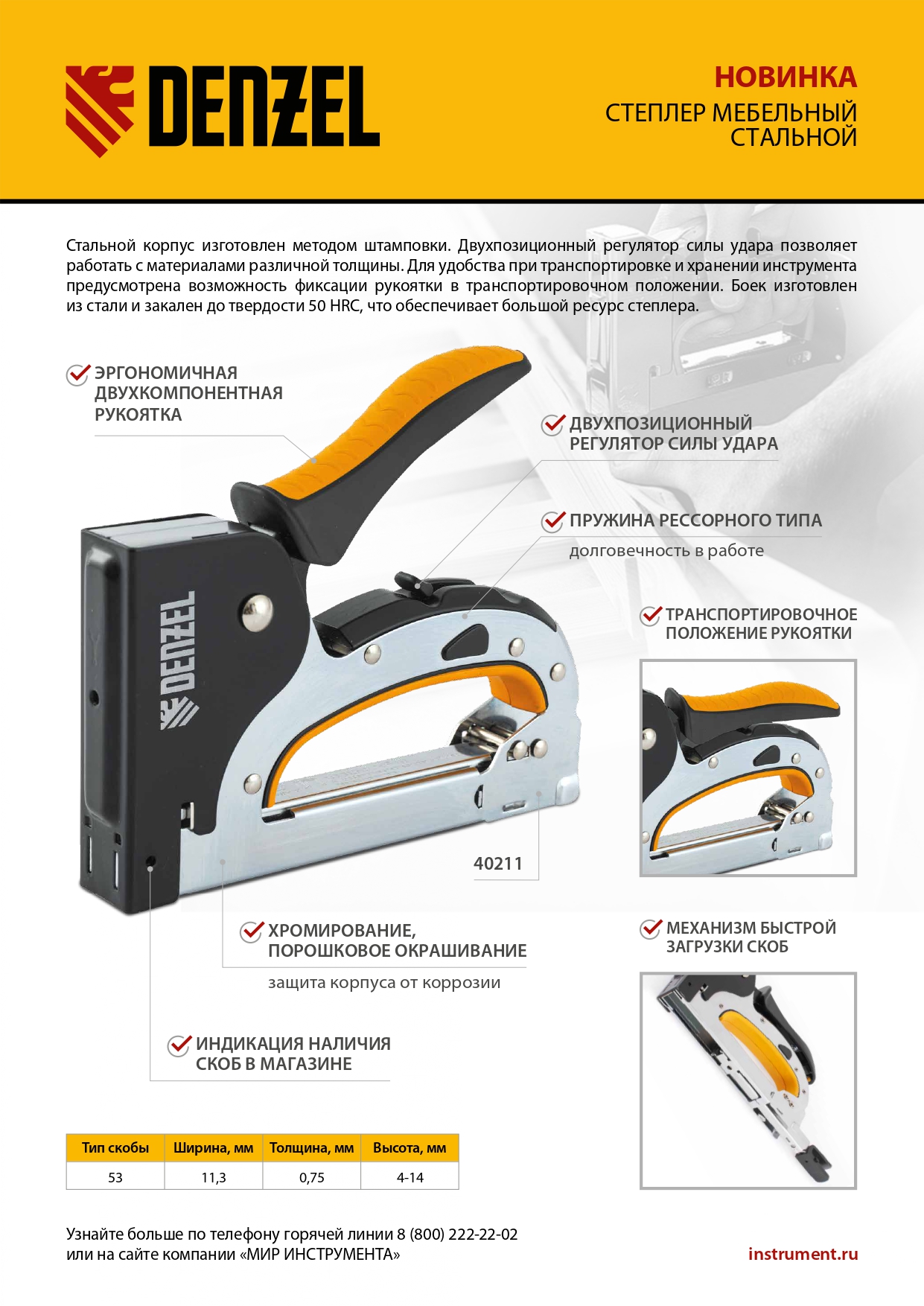 • Загрузка скоб в скобоприемник занимает несколько секунд, что экономит время мастера.