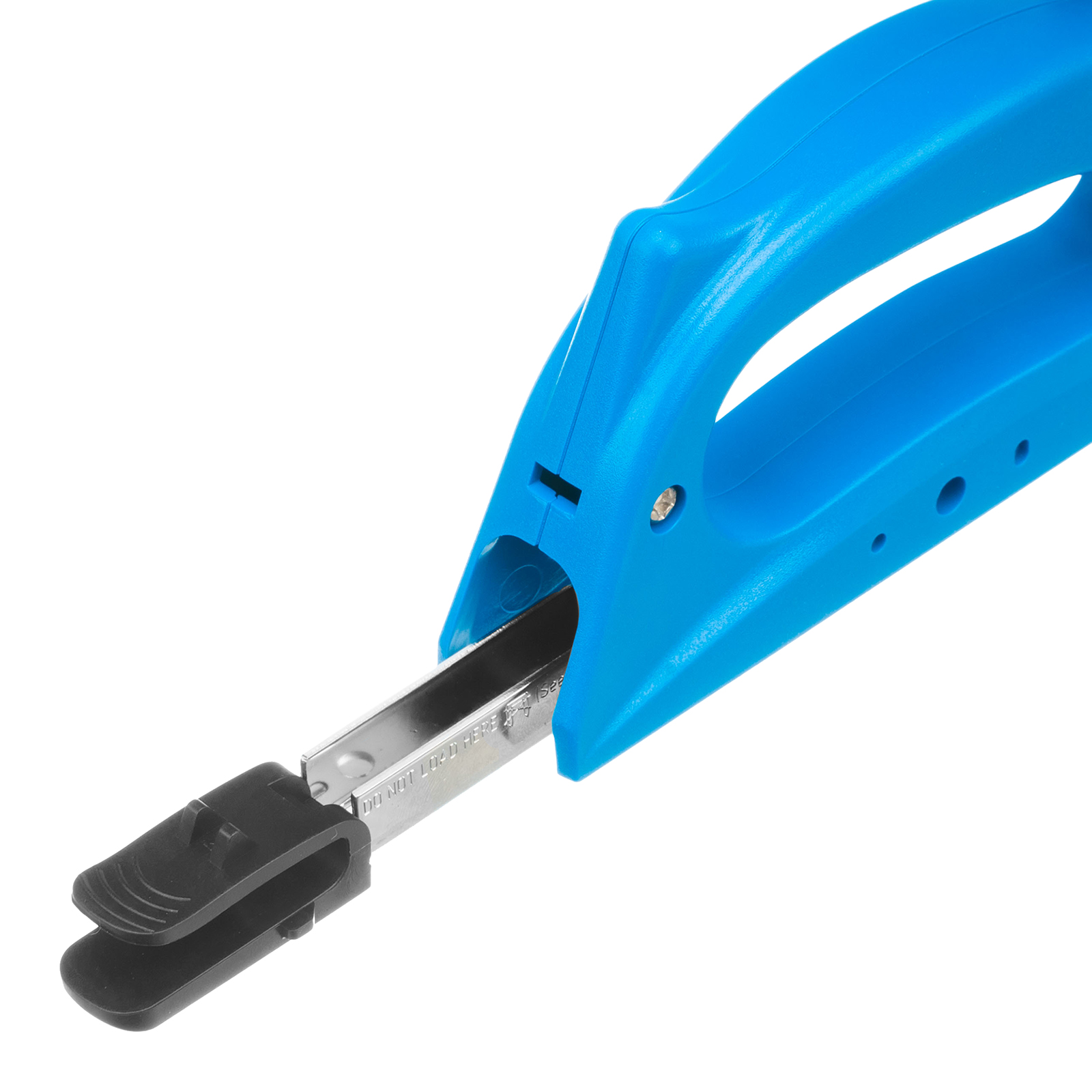 - Безопасное хранение и транспортировка — ручка фиксируется в нерабочем положении, что исключает случайное срабатывание степлера.