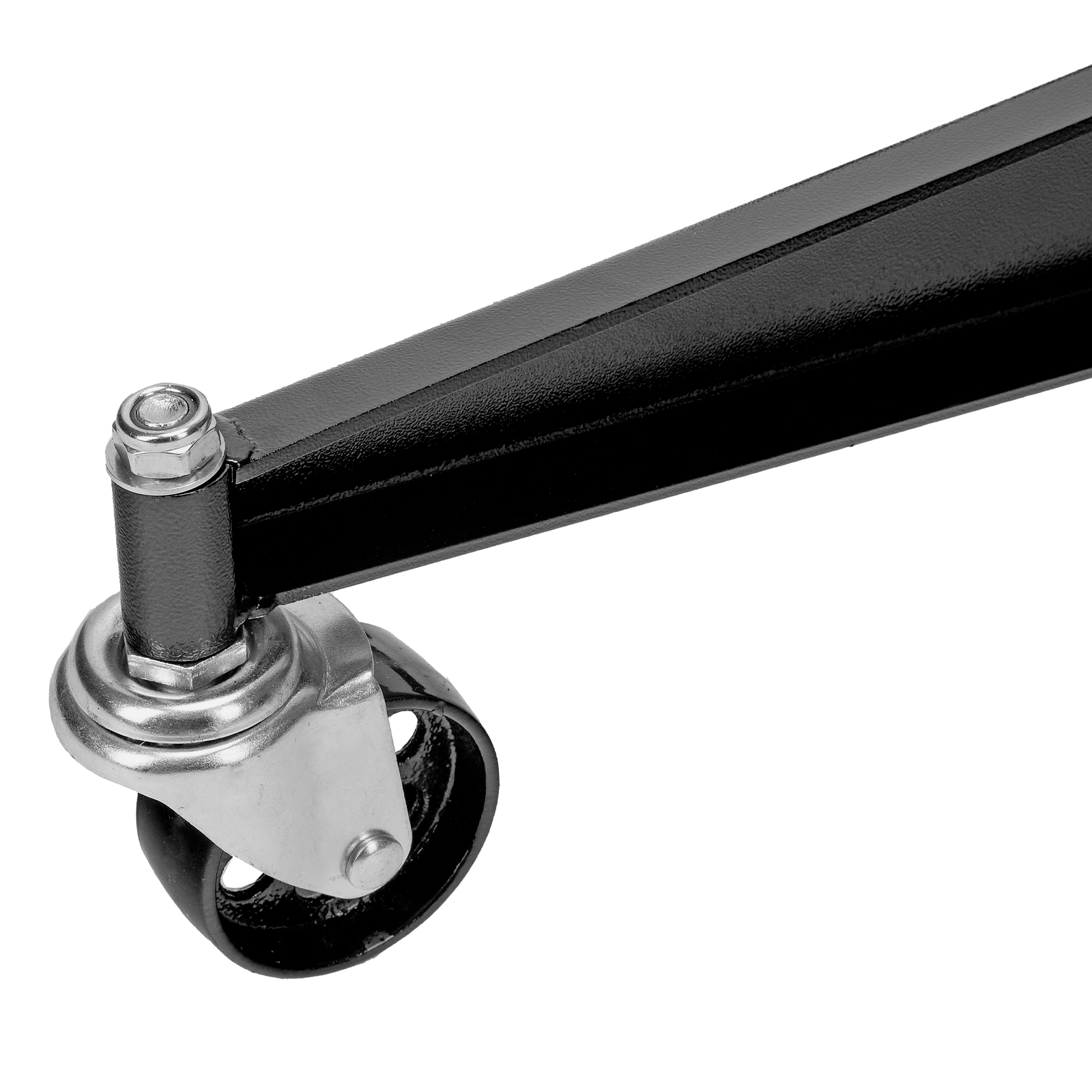 - Для удобства перемещения стойки по рабочей площадке предусмотрены колеса, а для ее надежной фиксации на месте — стопорные педали.