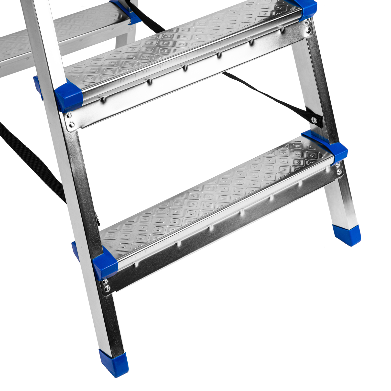 Стремянка двухсторонняя Сибртех 97984 со стальным профилем и 4 стальными ступенями помогает решать бытовые задачи на высоте, превышающей человеческий рост. Ее используют, чтобы доставать предметы с антресолей или шкафов, проводить уборку, менять лампочки, вешать полки или картины. Работать с электроинструментом на ней не рекомендуется. Стремянка с пластиковым складным механизмом повышенной стабильности и широким основанием очень устойчива на ровной поверхности. Площадка находится на высоте 88 см от опорной поверхности, рабочая высота стремянки составляет 288 см (при среднем росте пользователя 170 см).