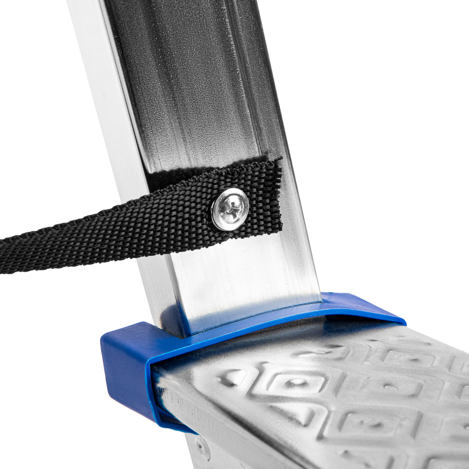 - Надежность — стремянка из стального профиля с широкими ступенями выдерживает вес до 120 кг, страховочные ленты из полиэстера повышают устойчивость.