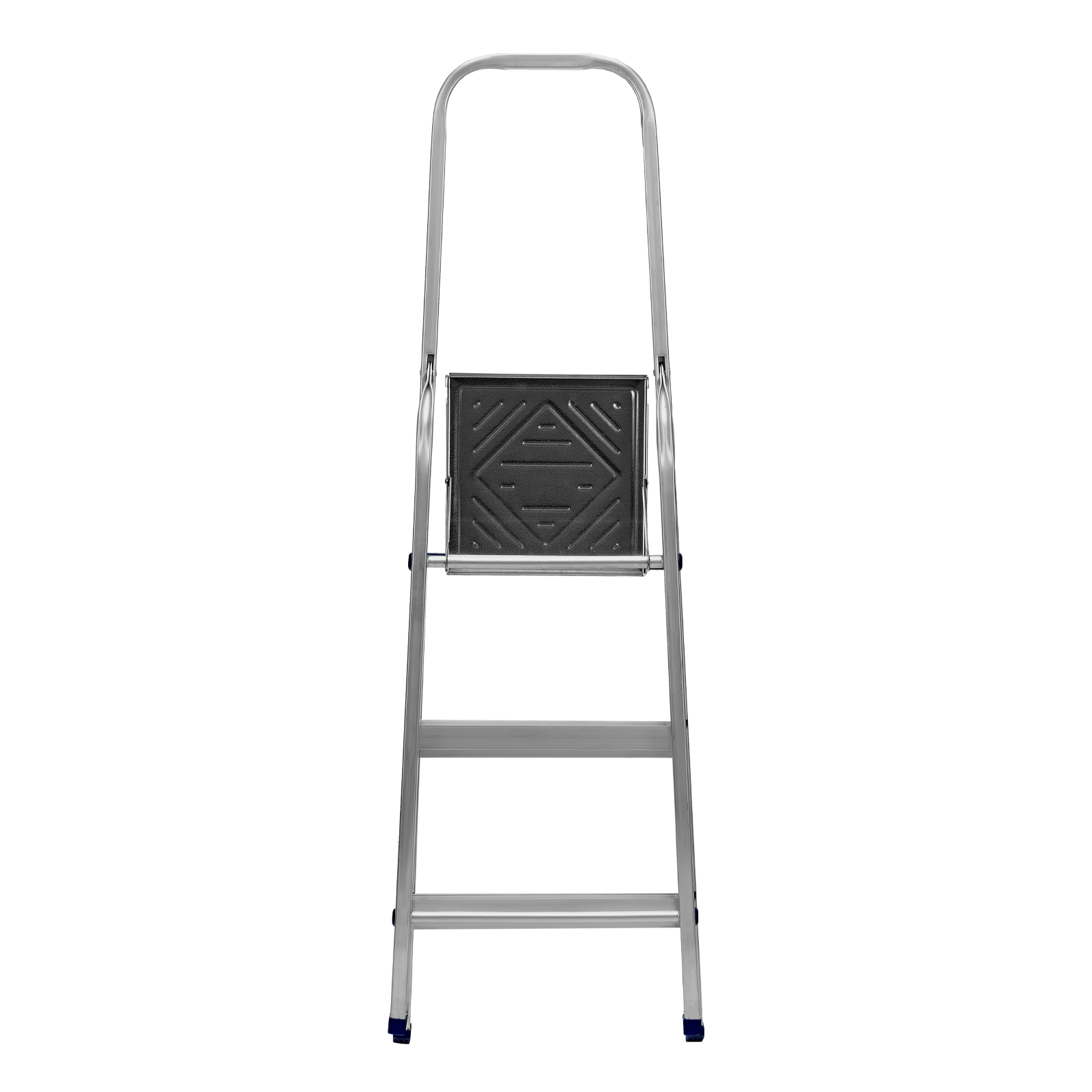 - Продуманная конструкция — стальная рабочая площадка с зацепами надежно фиксирует стремянку в разложенном положении.