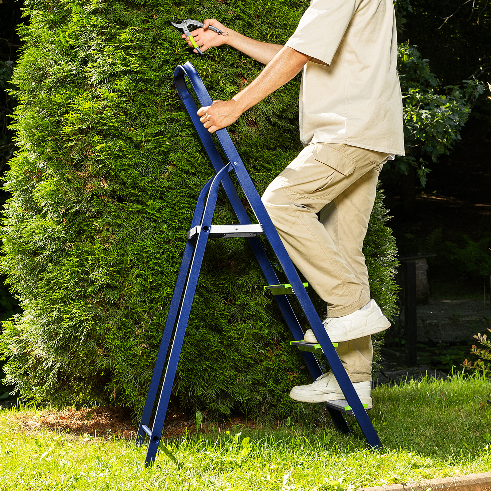 Стремянку следует устанавливать на ровную поверхность, работать на ней с электроинструментом нельзя.