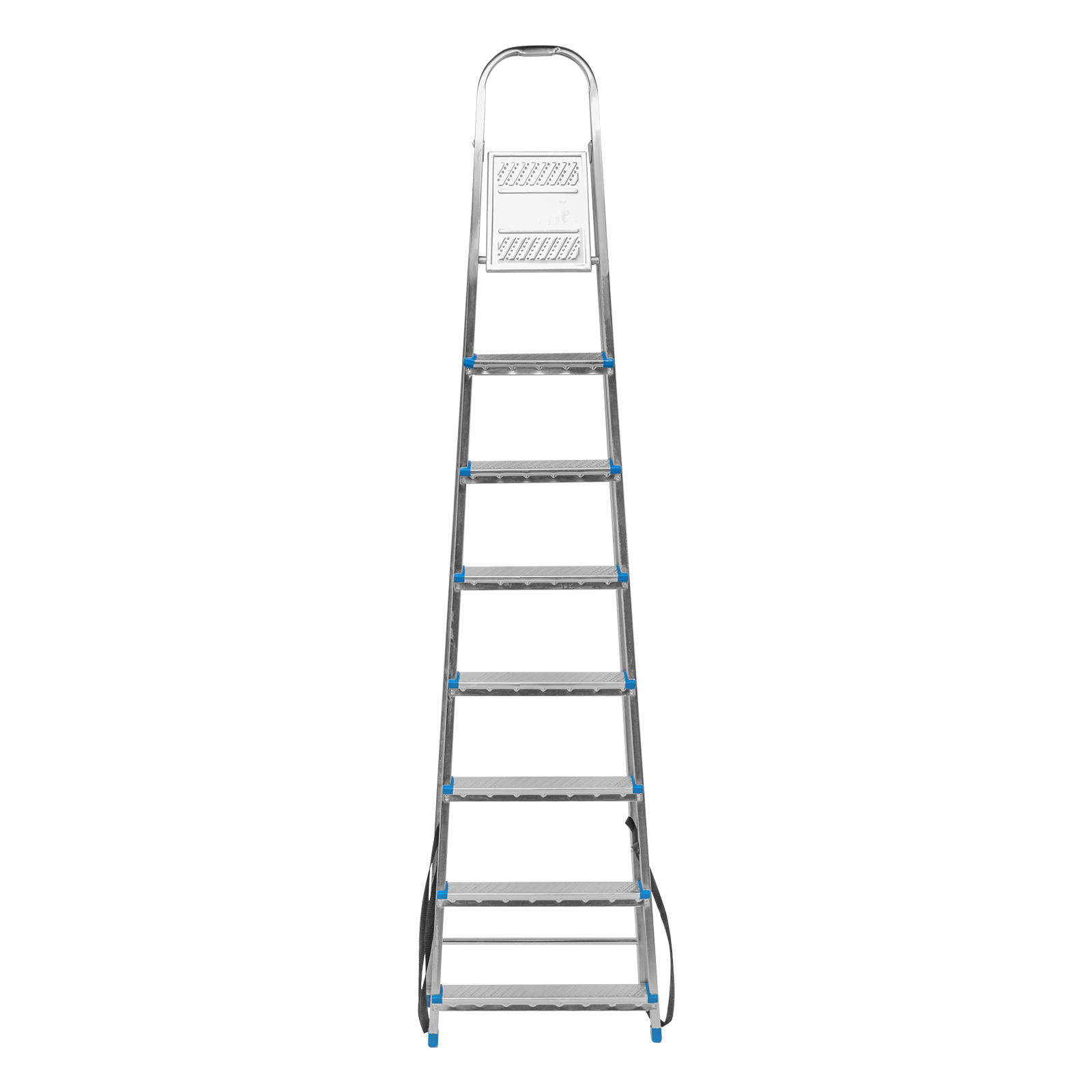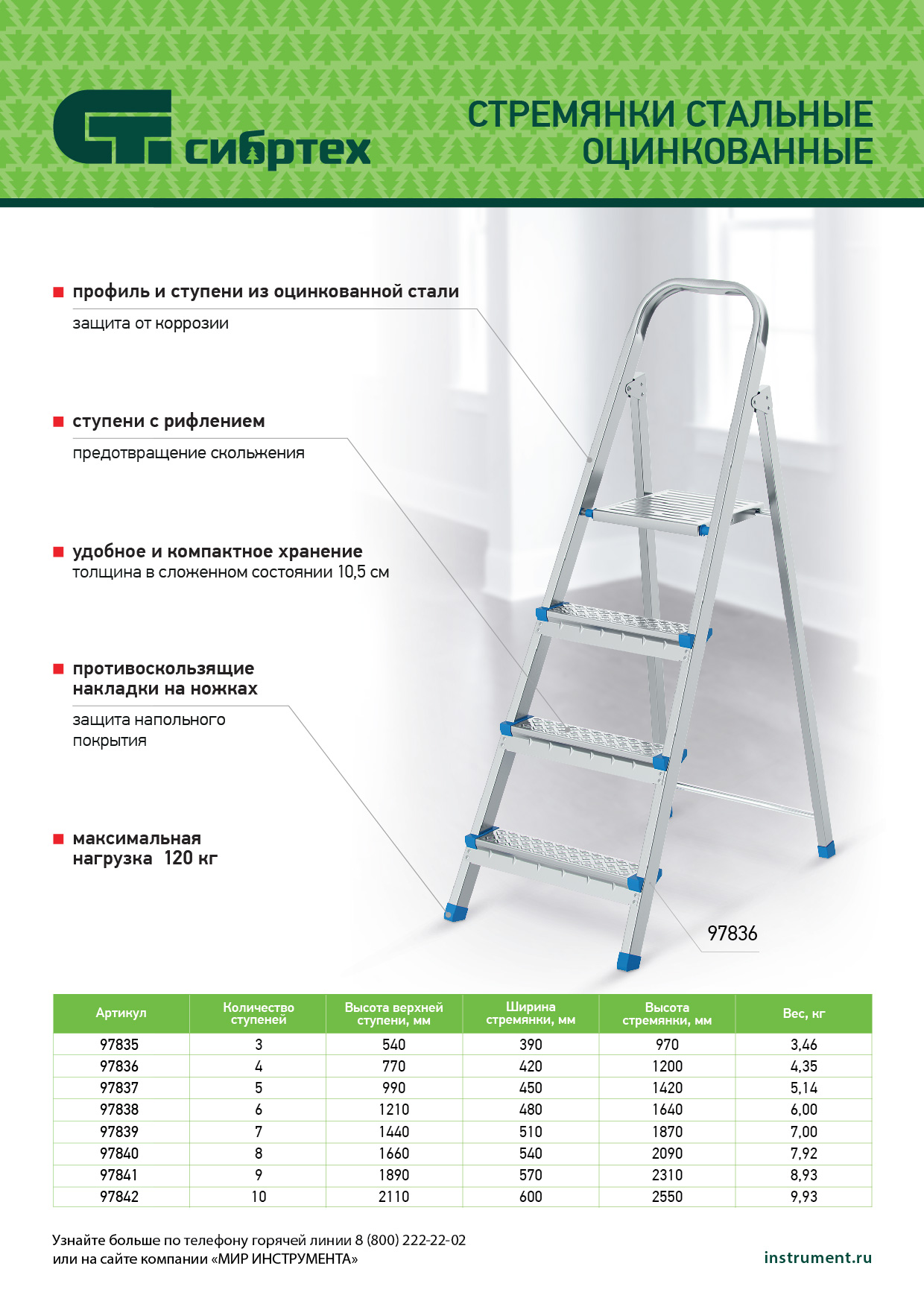 Стальная оцинкованная стремянка Сибртех 97840 с 8 ступенями позволяет выполнять ремонтные и садовые работы, для которых требуется доступ к предметам на высоте. Рама и ступени из стального профиля выдерживают вес до 120 кг. Расстояние от опорной поверхности до площадки составляет 166 см, при среднем росте пользователя 170 см рабочая высота лестницы — 366 см. Необходимо соблюдать технику безопасности: размещать стремянку только на ровной плоскости и не использовать ее для работы с дрелью, шуруповертом и другим электроинструментом.