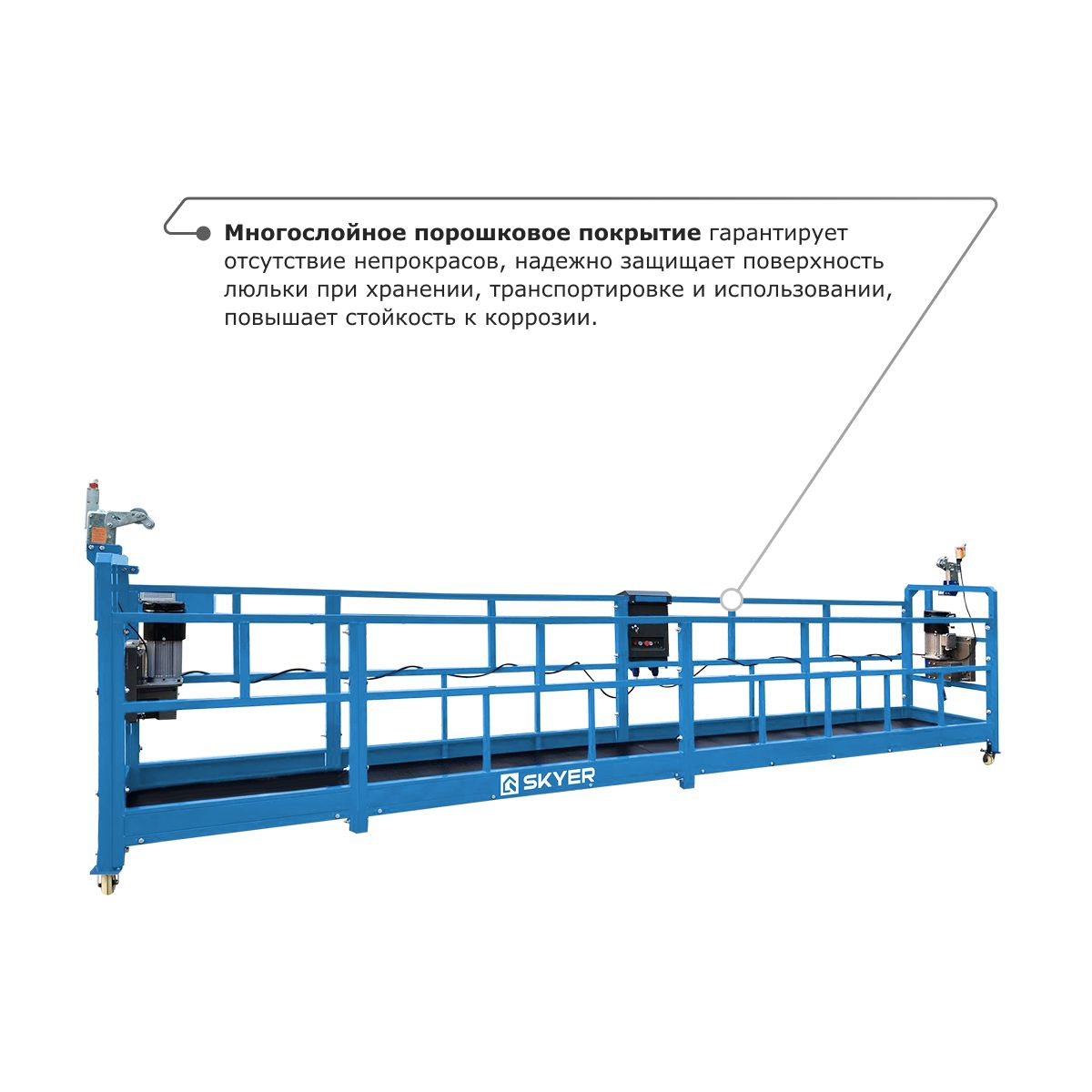 • Многослойное порошковое покрытие гарантирует отсутствие непрокрасов, надежно защищает поверхность люльки при хранении, транспортировке и использовании, повышает стойкость к коррозии.