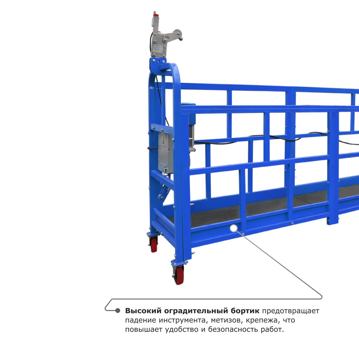 - Металлический отвод троса обеспечивает надежную защиту корпуса люльки и самого троса от протирания и повреждений.