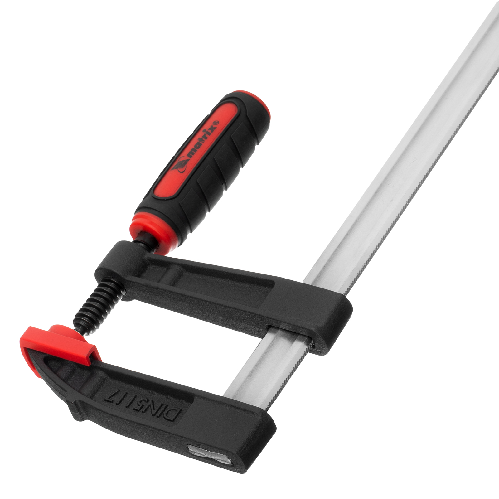 Усиленная F-образная струбцина Matrix 20401 размером 200 х 80 х 280 мм используется для зажима металлических, деревянных и других заготовок для их последующей обработки или сборки. Представляет собой штангу, на которой установлены 2 кронштейна — неподвижный и подвижный. Деталь помещается между ними и прижимается к губкам при помощи винтового зажима с трапециевидной резьбой. Величина захвата регулируется при помощи подвижного кронштейна и может достигать 200 мм. Струбцину используют для проведения слесарных и столярных работ. Металлическая конструкция выдерживает высокую температуру, поэтому инструмент пригодится для выполнения сварочных работ (перед началом необходимо снять пластиковые накладки с губок).