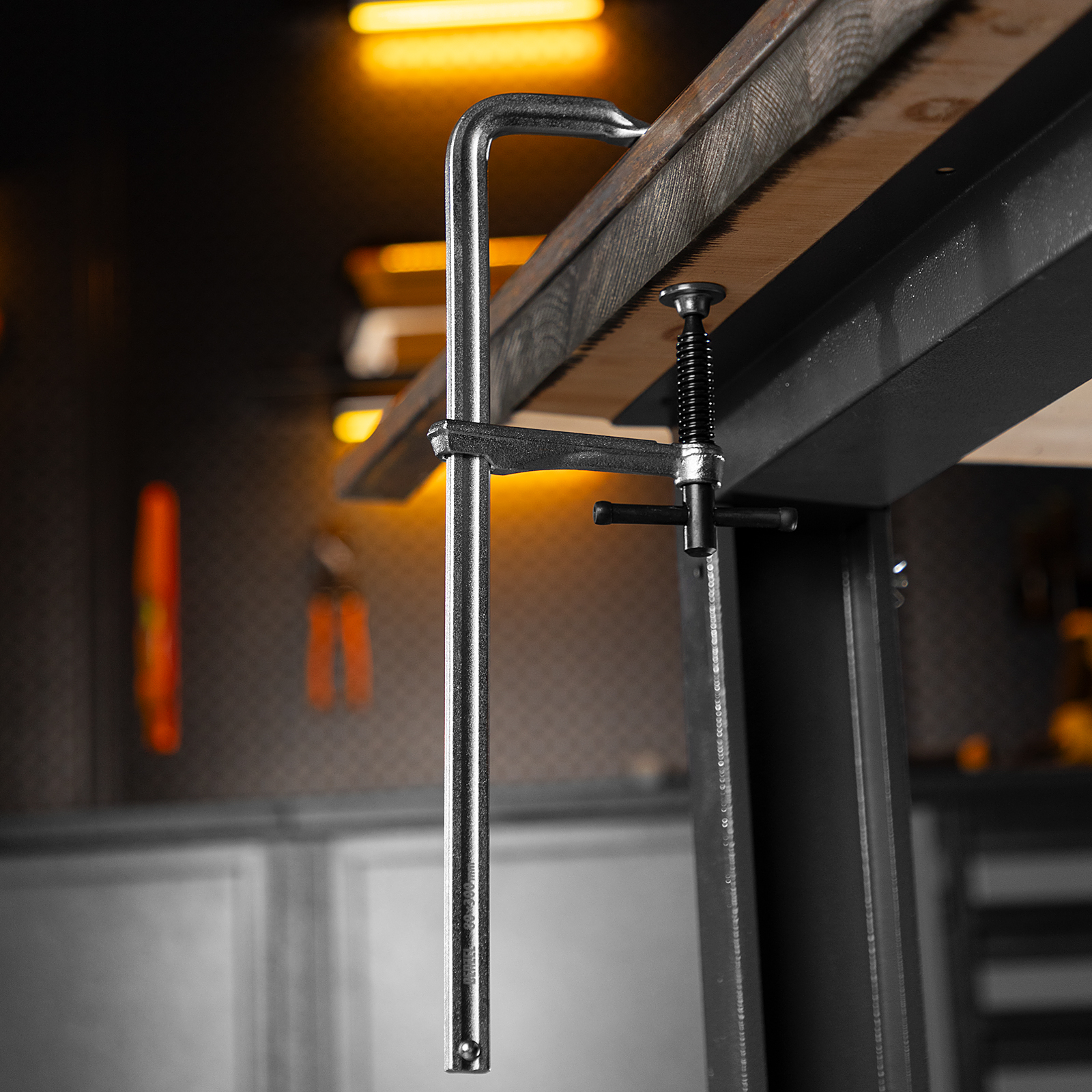Кованая F-образная струбцина Denzel 20466 с глубиной зажима 80 мм, усиленная, предназначена для фиксации деталей шириной до 300 мм и материалов при проведении слесарных, столярных и сварочных работ. Тавровый профиль обеспечивает устойчивость конструкции к изгибу, что позволяет фиксировать детали со значительным усилием. Струбцина подходит для профессионального применения.