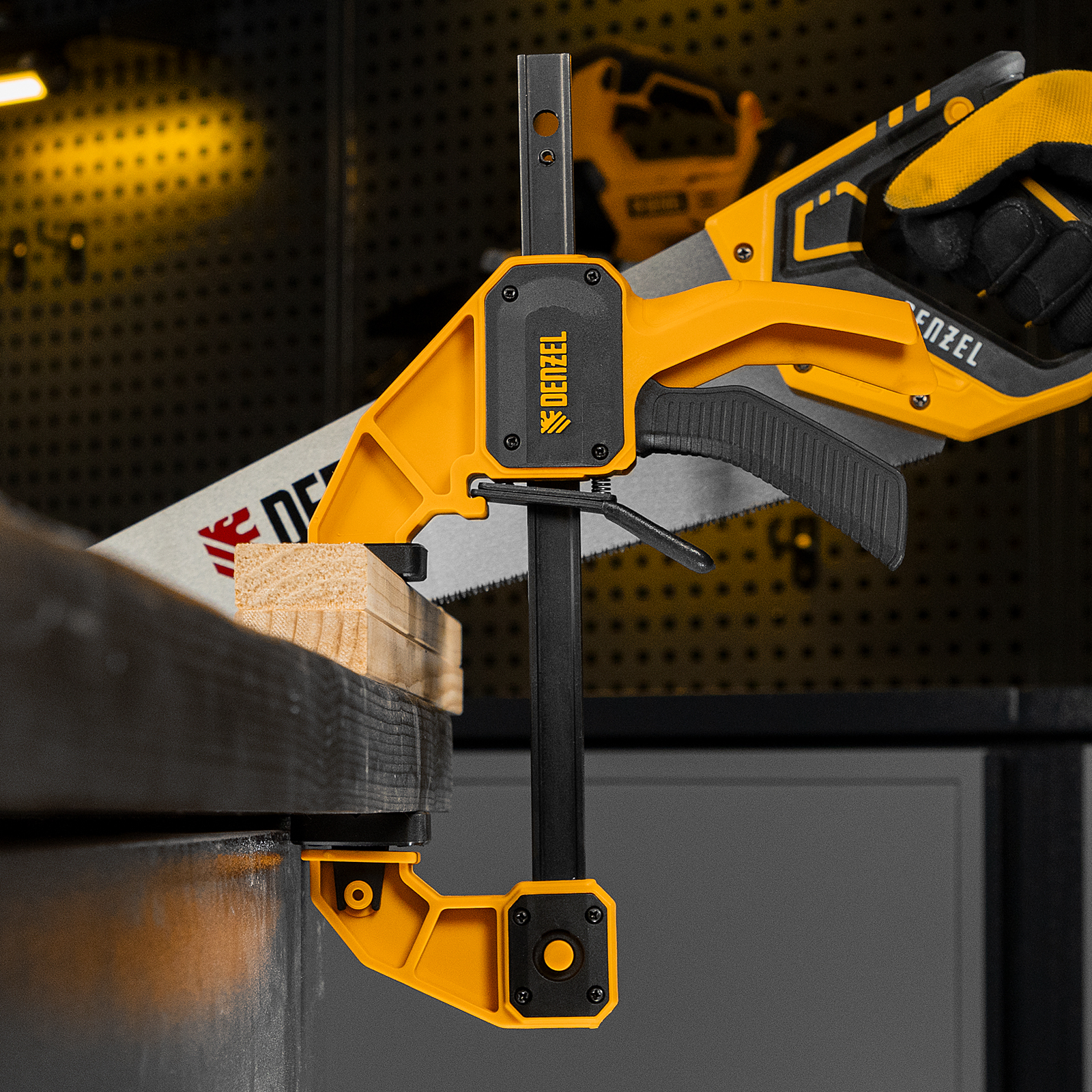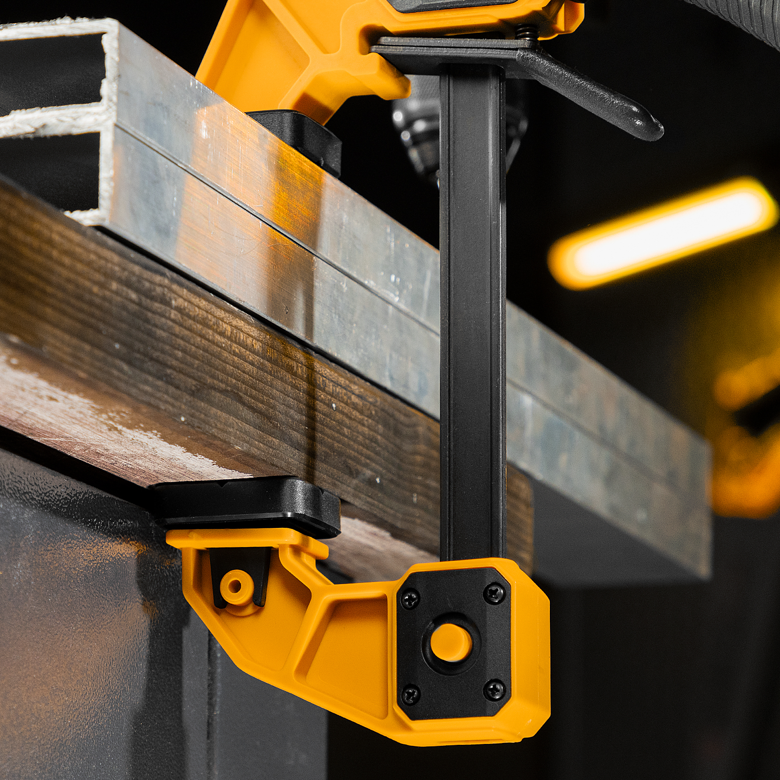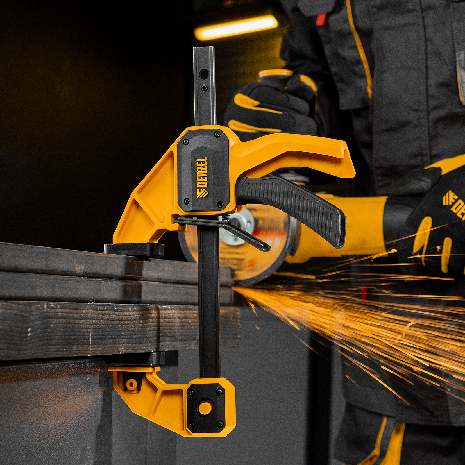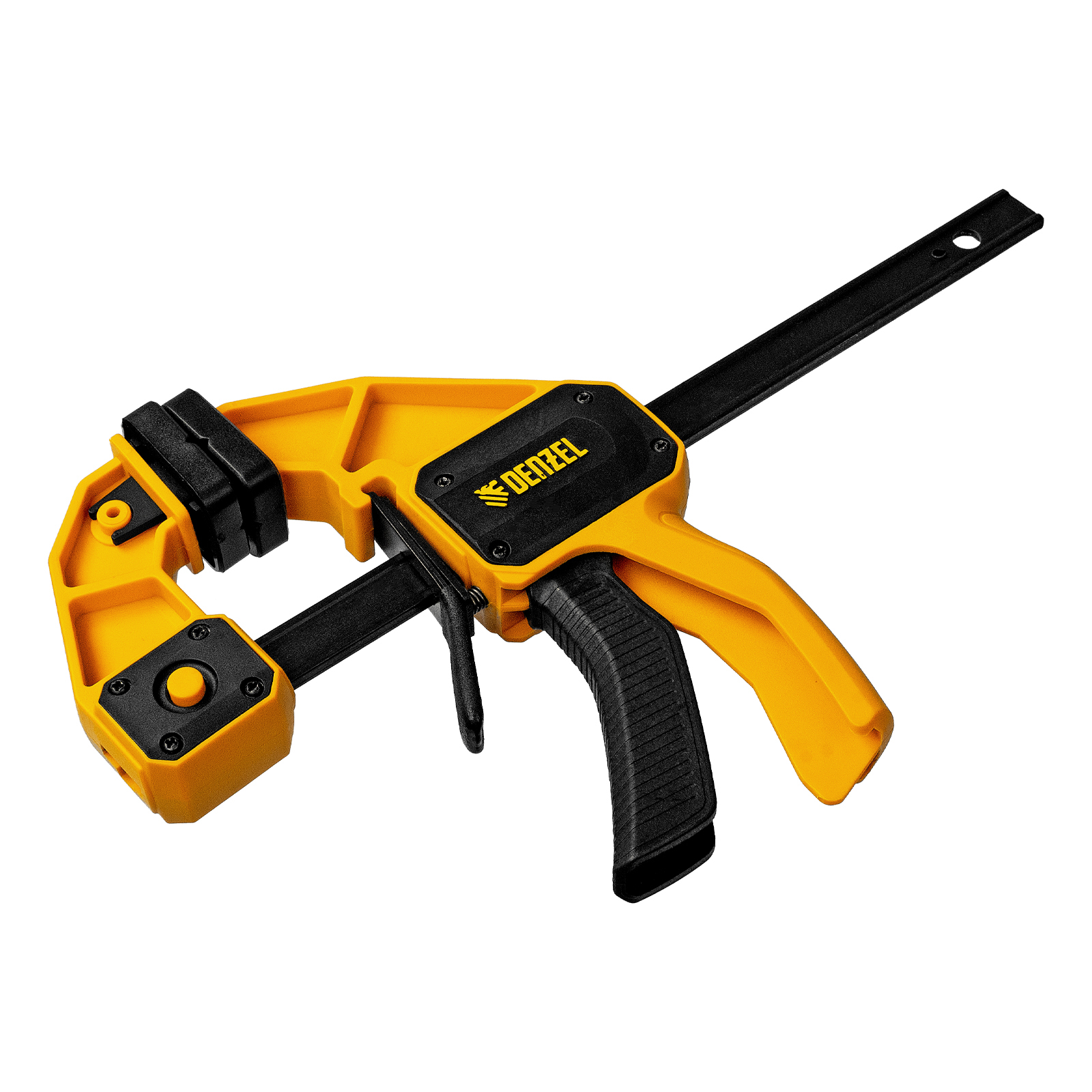 - Комфортное использование — струбцина весит всего 560 г, обрезиненная кнопка фиксации обеспечивает удобный захват.