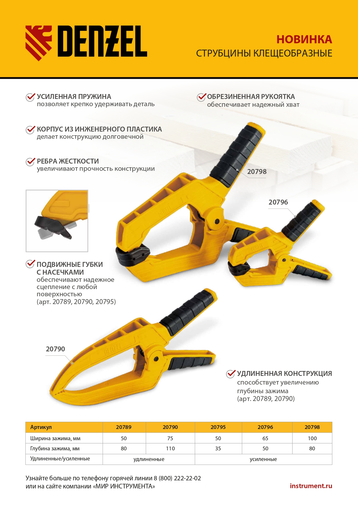 Струбцина клещеобразная удлиненная Denzel 20798 с глубиной зажима 80 мм, с двухкомпонентными рукоятками, способна удерживать детали толщиной до 100 мм. Будет полезна при склеивании или разметке заготовок. Подвижные губки с углублениями на прижимных поверхностях позволяют максимально точно позиционировать деталь при захвате. Струбцина пригодится в столярной мастерской, дома или на даче.