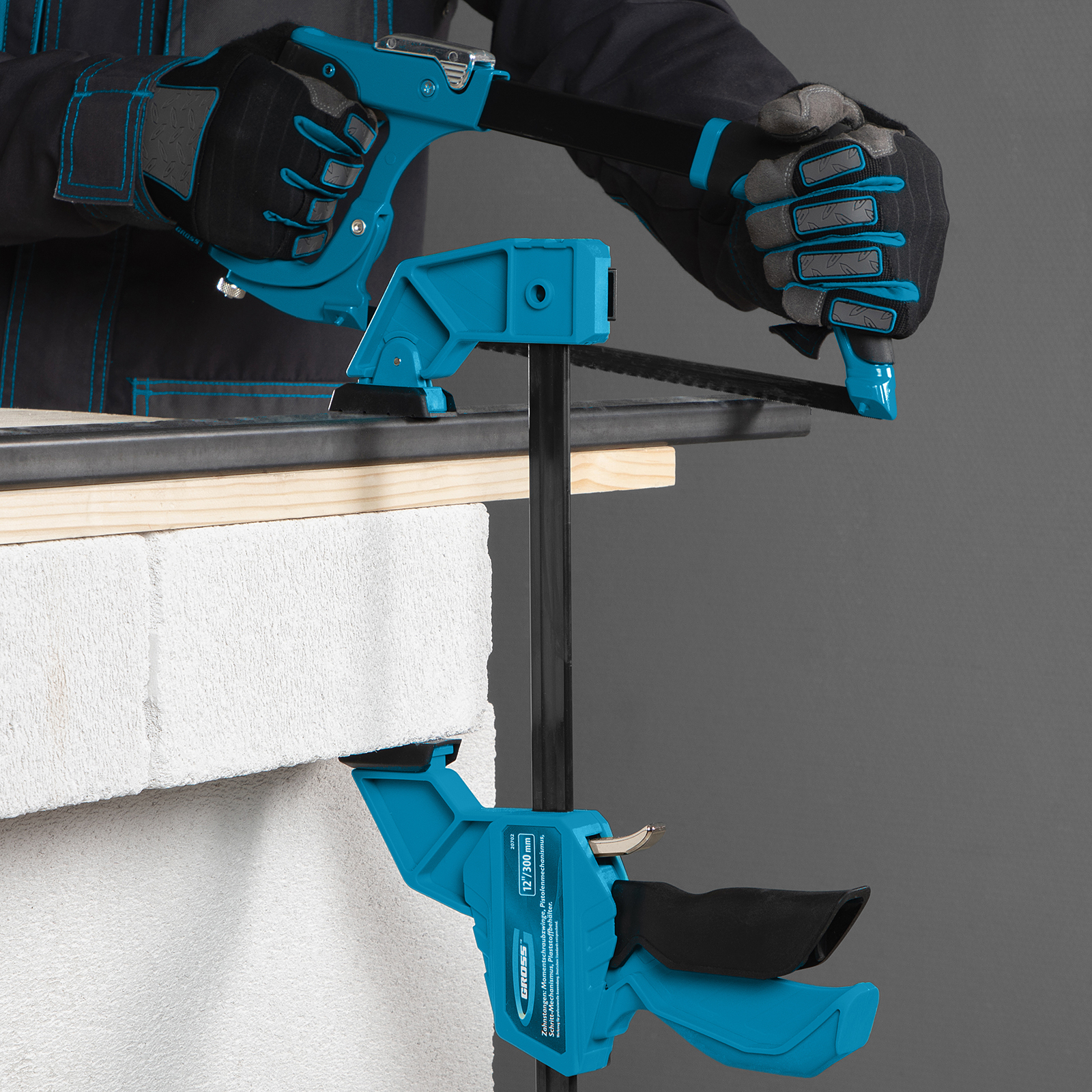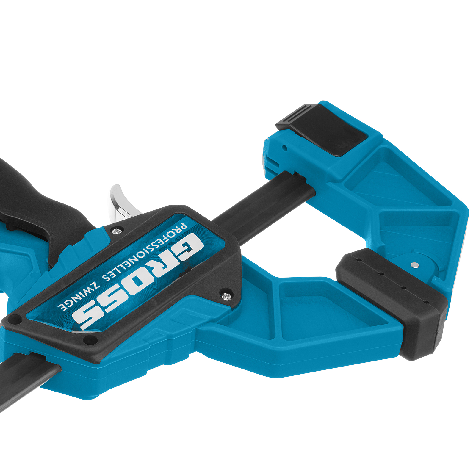 Реечная быстрозажимная струбцина Gross 20702 пистолетного типа, с пластиковым корпусом, с шириной зажима 300 мм, с пошаговым механизмом, используется для зажимания заготовок при выполнении столярных или монтажных работ. Удобна для фиксации деревянных деталей, т. к. пластиковые накладки на губках не повреждают их поверхность при сжатии. Подвижная губка пошагово перемещается по рейке, постепенно зажимая обрабатываемый предмет. Курковый фиксатор удерживает ее в заданном положении. Инструмент рекомендован для профессионального использования.
