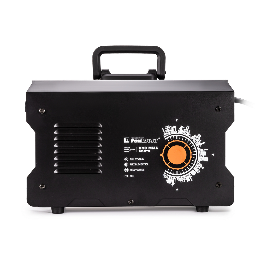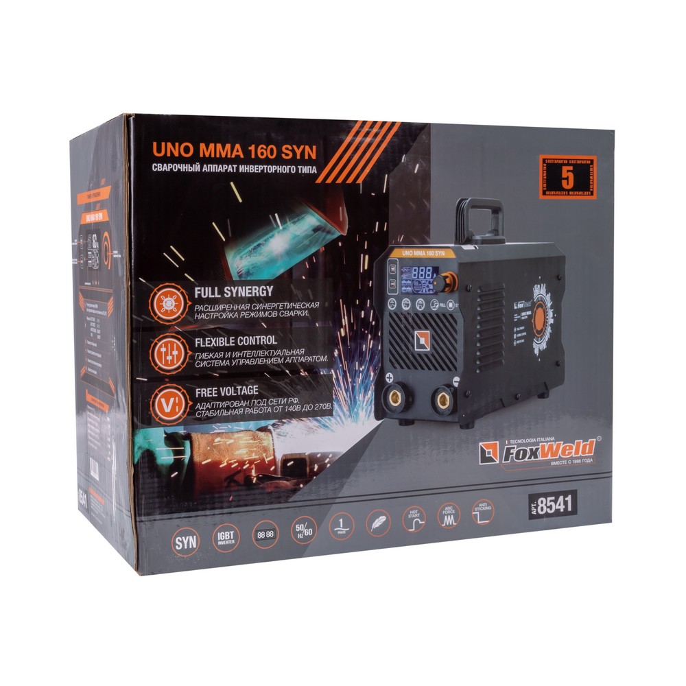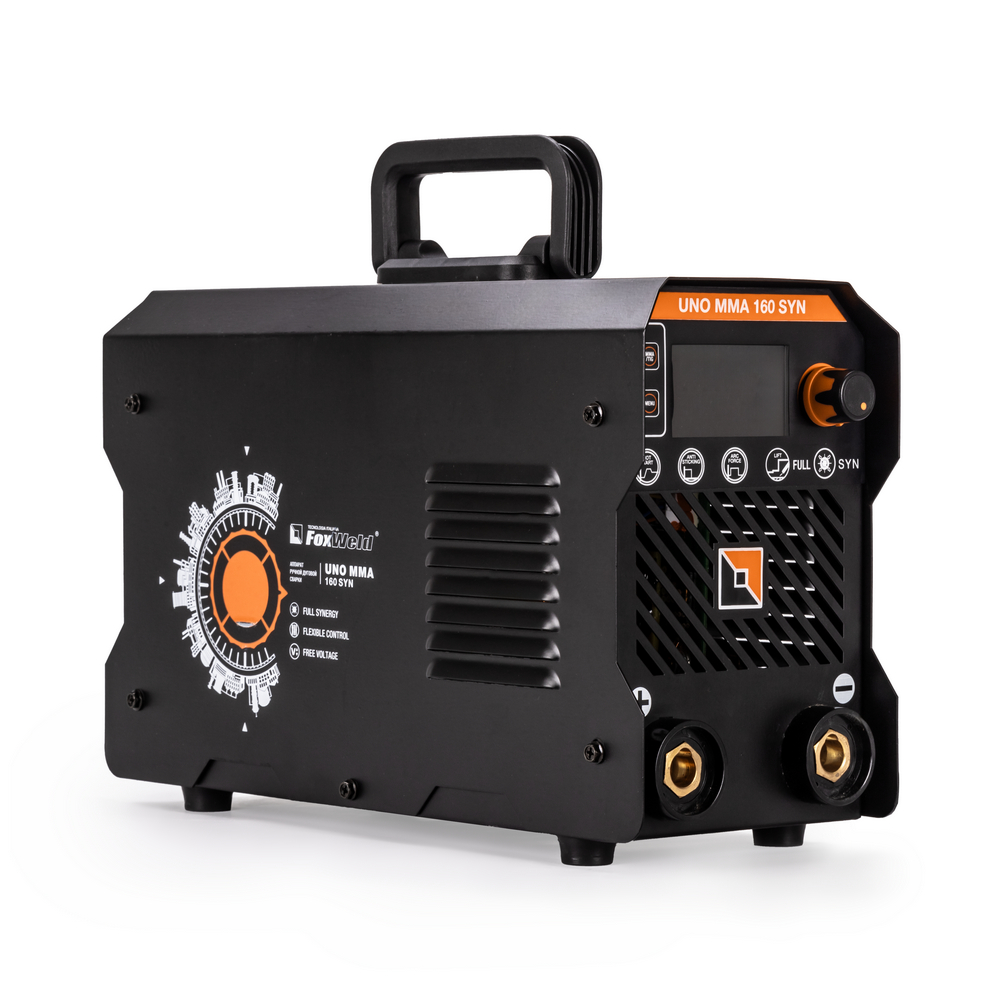Сварочный аппарат UNO MMA 160 SYN c синергетическим управлением предназначен для ручной дуговой сварки (MMA) любыми типами электродов, а также для сварки вольфрамовыми электродами в среде инертного газа аргон (TIG LIFT). В модели есть полноценная синергетика, которая рекомендует соотношение параметра силы тока сварки к толщине свариваемого сплава металла. Для облегчения процесса сварки в режиме ММА и получения более качественного сварного соединения аппарат имеет регулируемые функции Нot Start (горячий старт) и Arc Force (форсаж дуги), а также AntiSticking (антиприваривание) с возможностью отключения. Функция VRD повышает безопасность и исключает риск поражения сварщика электрическим током. Процесс сварки становится более безопасным в замкнутых пространствах и при сварке в условиях повышенной влажности. Режим TIG LIFT позволяет проводить аргонодуговую сварку на постоянном токе изделий из черной и нержавеющей стали. Данный вид сварки характеризуется отсутствием брызг и более презентабельным внешним видом сварного шва. Для проведения аргонодуговой сварки необходимо дополнительно приобрести горелку с вентилем и баллон с газом аргон.РАСШИРЕННЫЙ СИНЕРГЕТИЧЕСКИЙ РЕЖИМ УПРАВЛЕНИЯ: Синергетическое управление дает возможность модифицировать все сварочные параметры, осуществляя регулировку лишь одного из них. Наличие синергетического режима управления позволяет легко и быстро настроить аппарат под любую задачу. Преимущества синергетики: простота в настройке даже неквалифицированным персоналом, быстрая установка сварочных параметров, гарантированное получение качественного сварного соединения. Синергетику можно отключить для работы в ручном режиме.РАБОТА БЕЗ ОСТАНОВКИ: Параметр ПВ 100% на максимальном токе при КПД 85% обеспечивает бесперебойную устойчивую работу сварочного аппарата в течении всего рабочего дня. Это позволяет производить безостановочный сварочный процесс и выполнять работы, которые требуют больших временных затрат, что повышает скорость и производительность.РАБОТА ПРИ ПОНИЖЕННОМ НАПРЯЖЕНИИ: Аппарат работает от однофазной сети 220 В при перепадах напряжения от 140 до 270 В. Это даёт возможность производить сварочные работы в «плохих» сетях – на даче, в домашних условиях при пониженном или нестабильном напряжении.ИНФОРМАТИВНАЯ ПАНЕЛЬ УПРАВЛЕНИЯ: На лицевой панели рядом с клавишами управления расположен информативный цифровой экран, на котором отражены процессы и параметры сварки, установленные значения настроек. Задать параметры сварки можно при помощи двух кнопок и шаговой ручки регулировки. С помощью одной кнопки выбирается режим сварки: ручная дуговая покрытым электродом (MMA) или сварка неплавящемся вольфрамовым электродом (TIG LIFT). Вторая кнопка позволяет переключать параметры сварки, а при помощи плавного вращения ручки выставляются числовые значения.НЕБОЛЬШОЙ ВЕС: Небольшой вес и размеры сварочного аппарата плюс ручка на корпусе и ремень для переноски добавляют мобильности, компактности и идеально подходят для бытового и полупрофессионального использования.ПРЕИМУЩЕСТВА:Процесс поджига дуги сварки в среде Аргона вольфрамовым электродом происходит за счёт касанияПри условии работы от сети с некачественным электроснабжением, аппарат может хорошо работать с сетевым напряжением от 140 до 270 вольт, процесс сварки п