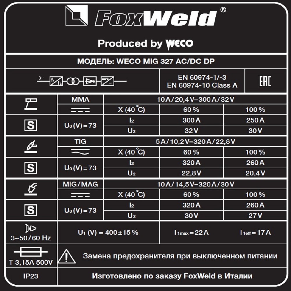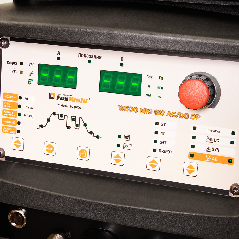 Сварочный полуавтомат FOXWELD WECO MIG 327 AC/DC DP — многоцелевой многофункциональный аппарат 7в1, идеальное решение для задач малого и среднего производства.  Модель WECO MIG 327 AC/DC DP охватывает все области применения: учебные центры, машиностроение, авиастроение, нефтехимия, промышленность. Полноценный аргонодуговой аппарат TIG AC/DC в едином исполнении со сварочным полуавтоматом MIG позволит сократить время на обучение персонала, освободить пространство в рабочей зоне и быстро выполнять различные проекты. Выполнив сложную сварку корня шва в режиме TIG, ускорьте производительность, используя режим MIG со специальными функциями и синергетикой для заполнения разделки.Аппараты FoxWeld серии WECO собрали в себе опыт разработки и эксплуатации профессионального сварочного оборудования, начиная с 1998 г. Все аппараты линейки WECO разрабатываются и производятся в Италии на заводе Corso Noblesville. Высокое качество производства и надежность наших аппаратов позволяют обеспечивать расширенную гарантию на всю линейку FoxWeld серии WECO.ФУНКЦИЯ POWER FOCUS: Концентрация дуги POWER FOCUS позволяет сварщику сфокусировать высокую температуру дуги в центральной части сварочной ванны, избегая таким образом перегрева кромок. Это новая технология сварки деталей из углеродистой стали используется, когда требуется глубокий провар в сочетании с высокой производительностью. Сфокусированная дуга позволяет делать меньшее число проходов для заполнения стыковых швов.ФУНКЦИЯ POWER ROOT: Функция вместе с синергетическими программами оптимизирует холодно-капельный перенос металла для получения высокого качества сварки корневого шва углеродистых и нержавеющих сталей, в том числе аустенитных. Технология обеспечивает улучшенную форму шва при сварке тонких деталей и при выполнении вертикальных швов с большим зазором.ФУНКЦИЯ HIGH CONTROL: Новая система High Control (Pulse НС) отличается эффективным контролем дуги для оптимизации отрыва капель при максимально сниженной мощности источника. Благодаря работе этой системы сварочная дуга становится более стабильной, не образуются брызги и наплывы, появляется отзывчивость к движению горелки, снижается тепловложение и происходит оптимальное оплавление кромок детали.РЕЖИМ HSL: Этот режим сварки стали и цветных металлов отличается очень короткой и интенсивной дугой, что позволяет достигать стабильного горения сварочной дуги без повышенного напряжения. Благодаря этому процессу не происходит перегрева и усадочной деформации основного материала, как следствие изделие имеет лучшие механические свойства.WECO HAC: Уникальная система WECO HAC (Hybrid Arc Control) обеспечивает плавную и очень стабильную сварочную дугу с превосходных качеством сварного шва и минимальным разбрызгиванием в любых условиях работы. Эта функция подходит для работ в вертикальном и потолочном положении и обеспечивает хорошее проплавление кромок, низкий нагрев и малую деформацию основного металла.ПРЕИМУЩЕСТВА:Сварочные процессы: MIG/MAG (SYNERGY, PULSE, DOUBLE PULSE), TIG AC/DC (полноценный со всеми настройками), MMA, GOUGINGСпециальные функции в режиме MIG/MAG: POWER FOCUS, POWER ROOT, HIGH CONTROL, HSLСпециальные функции в режиме TIG: Q-START, Q-SPOT, DYNAMIC ARC, MULTITACK, MIX AC/DC, EXTRA FUSION, BALANCE AC5 функций в режиме MMA: Hot Start, Arc Force, AntiSticking, DYNAMIC ARC, VRDВозможность подключения двух механизмов подачи (опционально)Расширенная синергетика для режимов TIG и MMAВозможность отключен