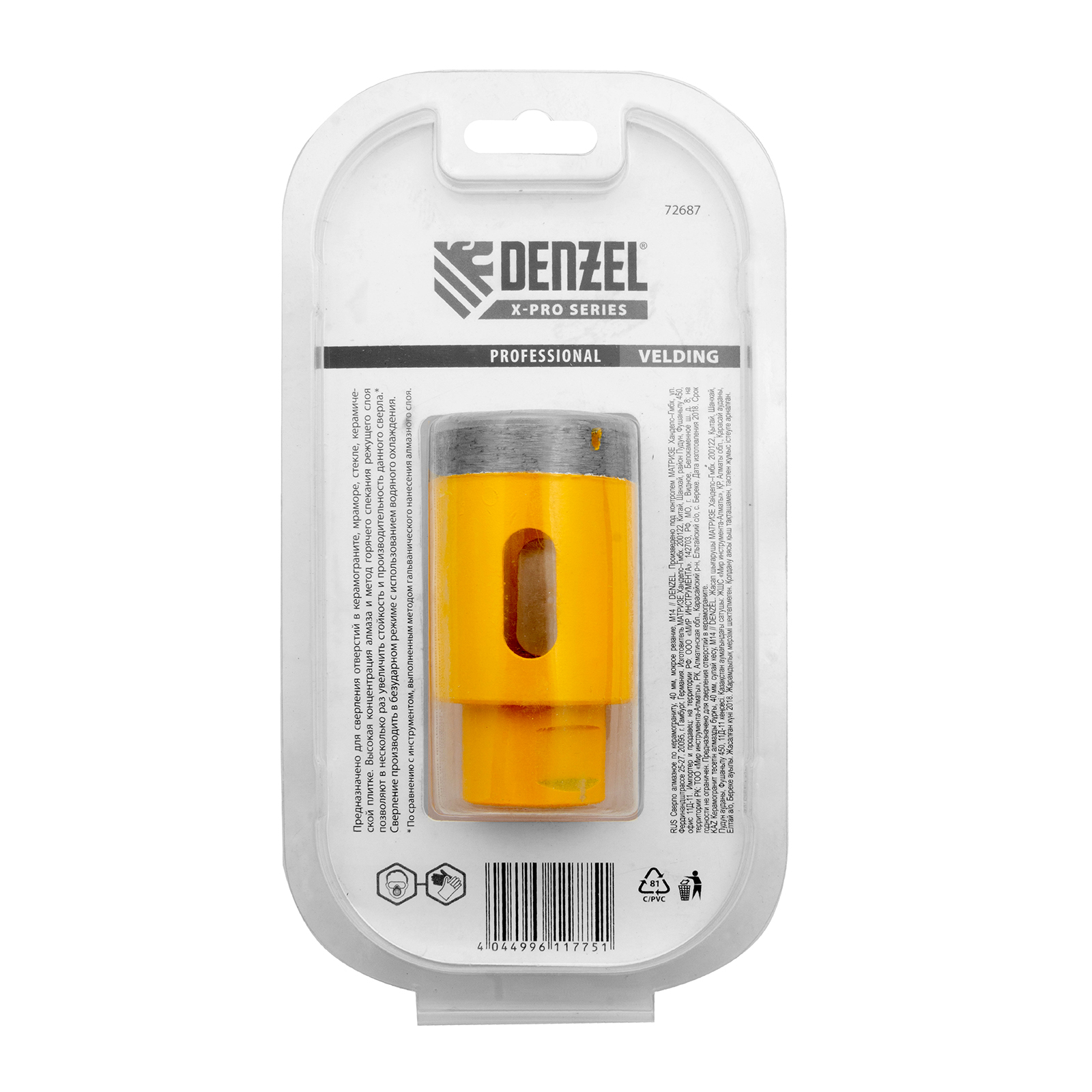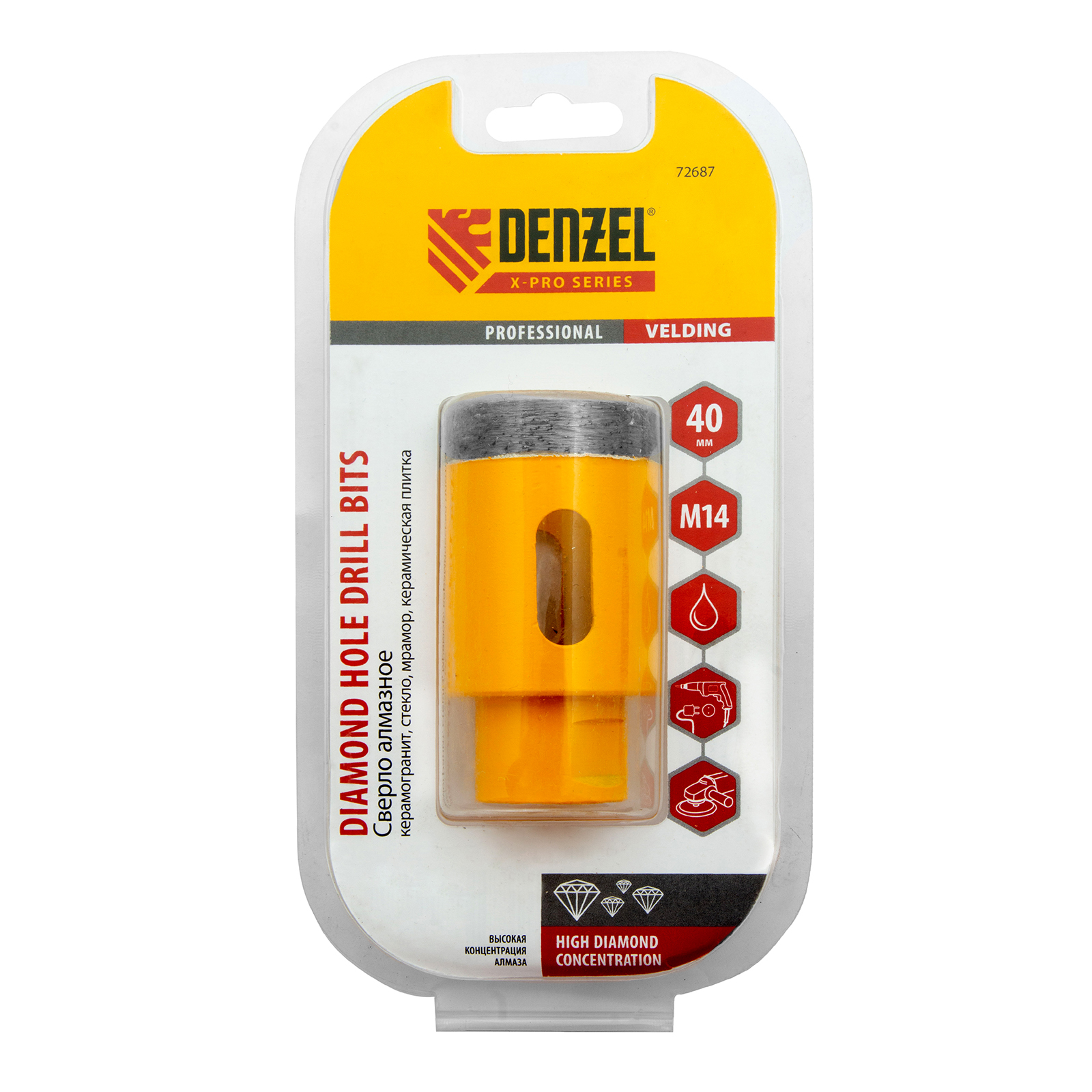 Алмазное сверло Denzel 72687 диаметром 40 мм, с резьбой М14, предназначено для «мокрого» сверления по керамограниту, мрамору, стеклу и керамической плитке. Позволяет получать ровные отверстия без сколов, используется для проведения ремонтных и отделочных работ. Сверло (коронку) устанавливают на вал углошлифовальной машины, благодаря чему скорость сверления увеличивается в несколько раз по сравнению с дрелью или шуруповертом. Применение водяного охлаждения повышает срок службы оснастки. Чтобы точно позиционировать сверло при сверлении дрелью, рекомендуется использовать кондуктор (арт. 72830).