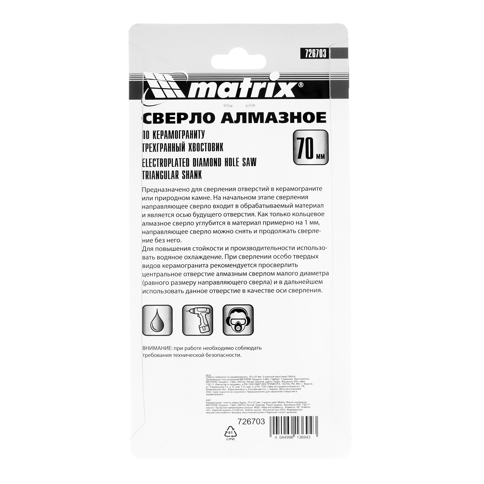 Универсальное алмазное сверло по керамограниту Matrix 726703 размером 70 х 67 мм, с 3-гранным хвостовиком, применяется для получения отверстий в стекле, плитке, кафеле. За счет высокой концентрации алмазов в режущем слое оно легко справляется со сверлением керамогранита. Сверло рассчитано на профессиональное использование с дрелями и шуруповертами. Водяное охлаждение в процессе работы значительно повышает срок службы оснастки.