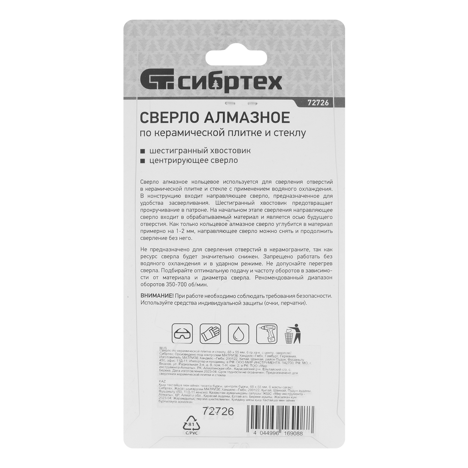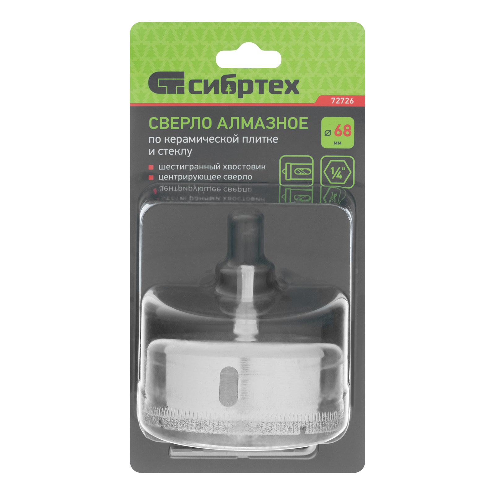 Сверло Сибртех 72726 размером 68 х 55 м, с шестигранным хвостовиком и центрирующим сверлом, позволяет получать отверстия в керамической плитке и стекле. Его устанавливают на дрель или шуруповерт, рекомендуемый диапазон рабочих оборотов 350-700 об/мин. Оснастка используется при выполнении бытовых ремонтных и отделочных работ.