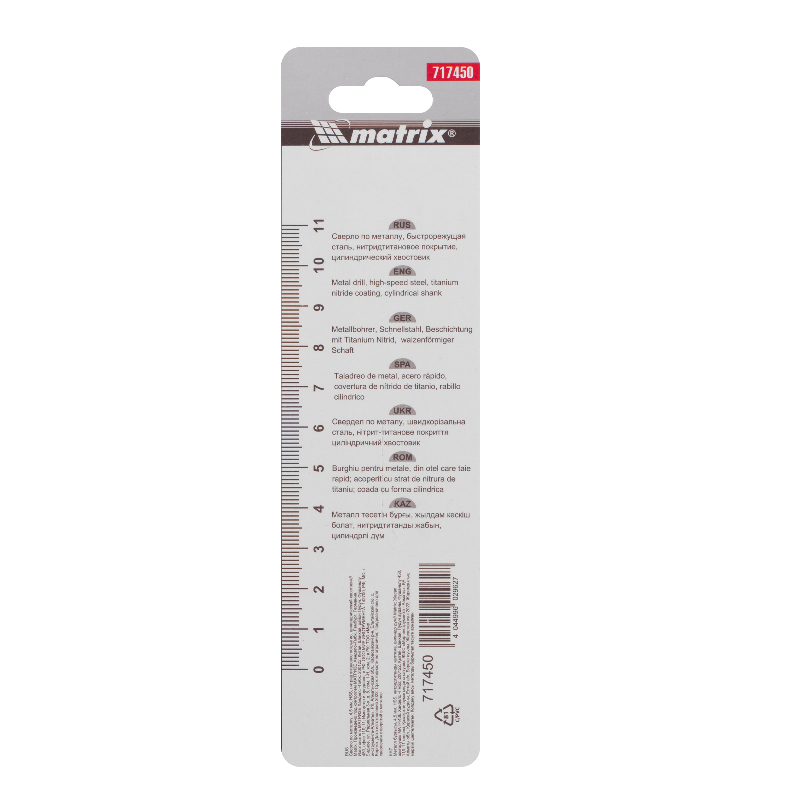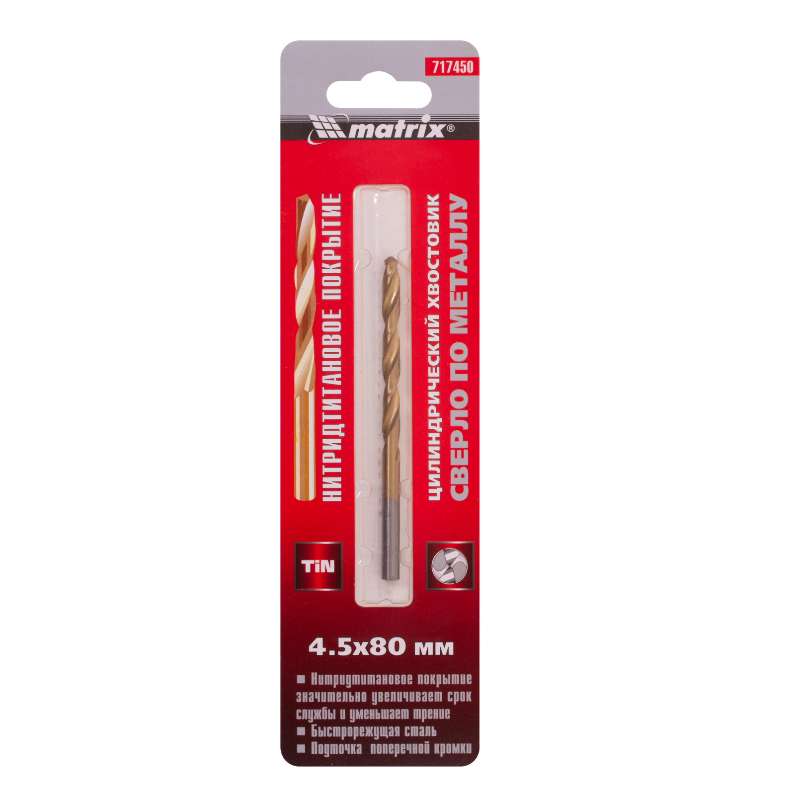 Сверло по металлу, 4.5 мм, HSS, нитридтитановое покрытие, цилиндрический хвостовик Matrix