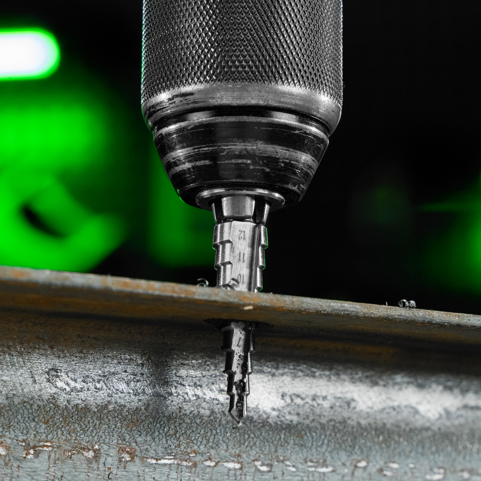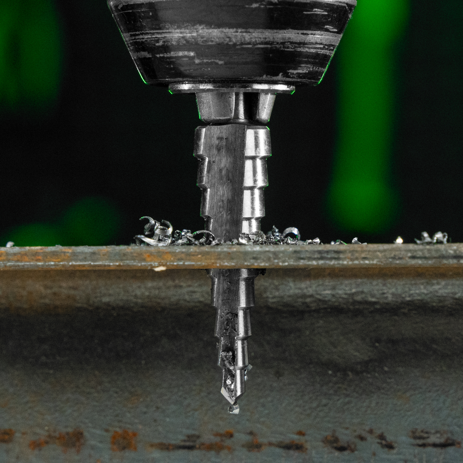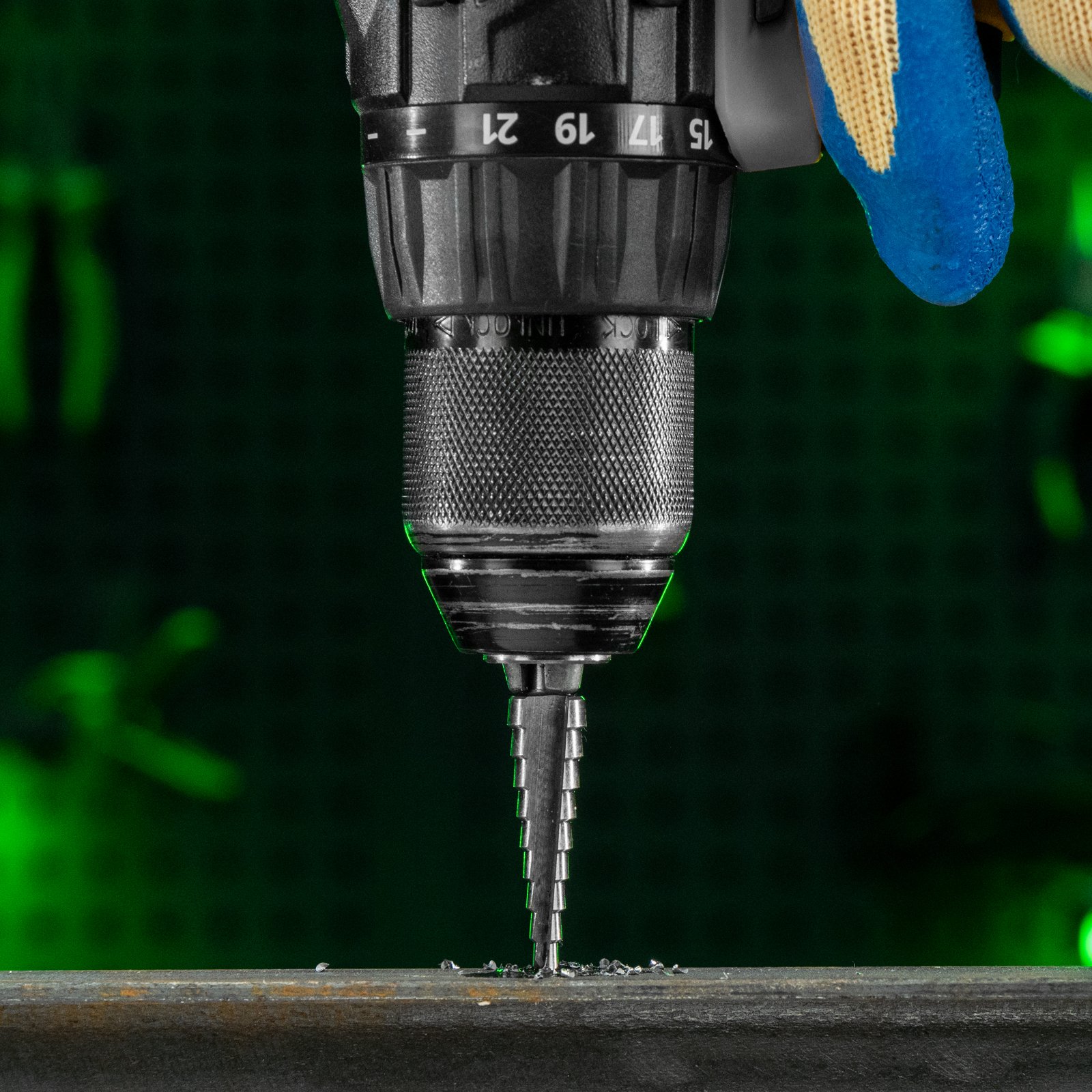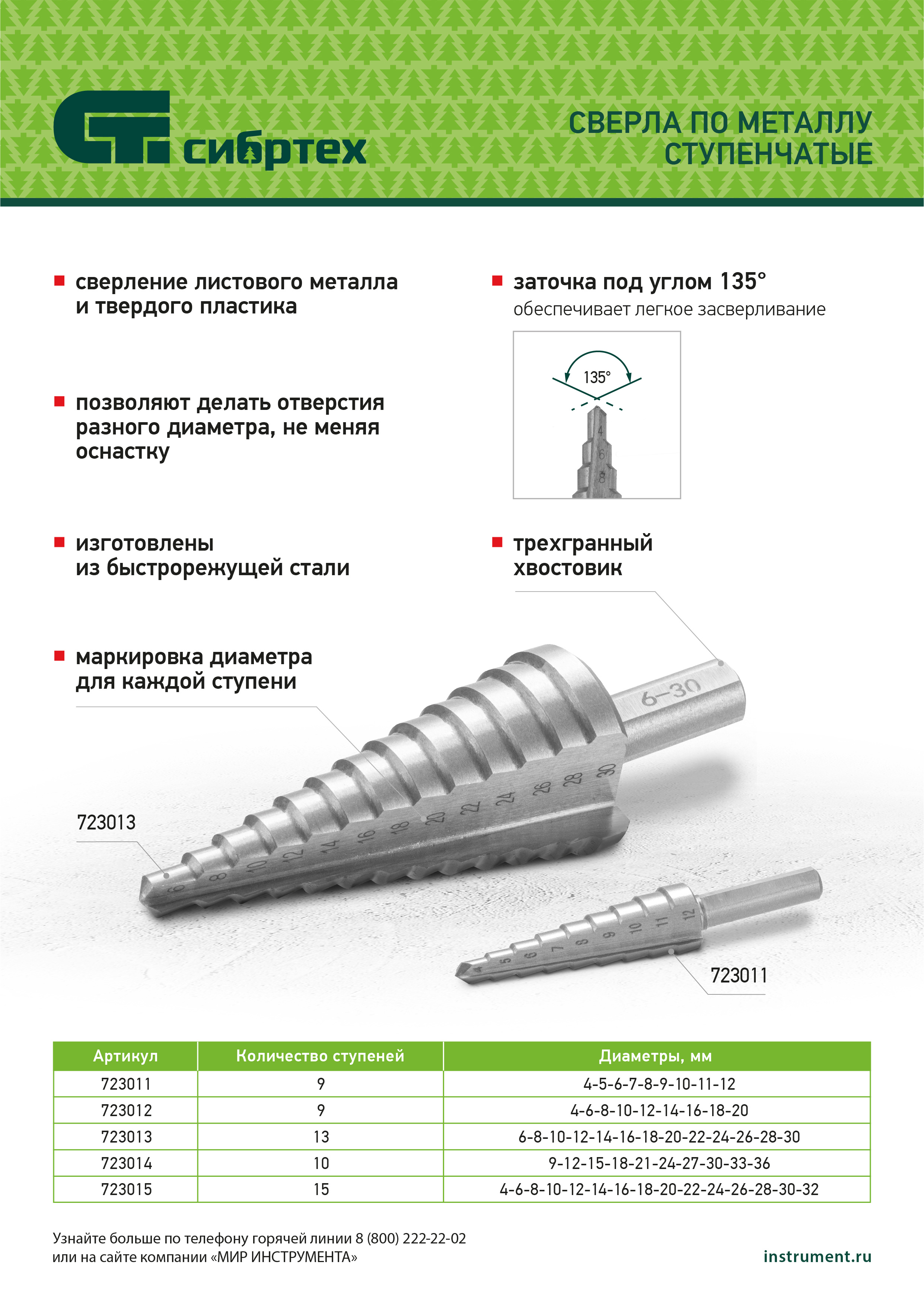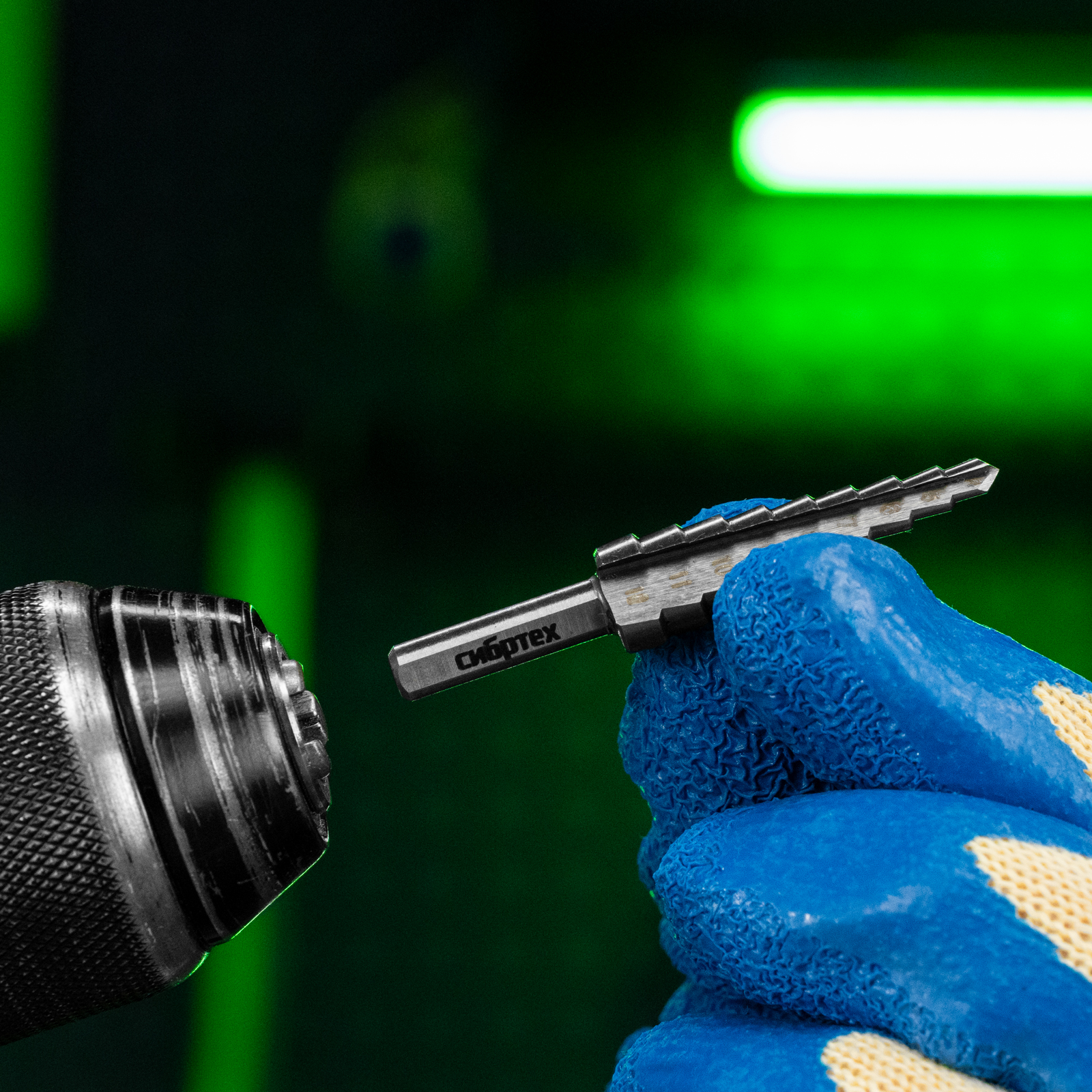 Ступенчатое сверло Сибртех 723011 предназначено для сверления отверстий диаметром от 4 до 12 мм в сталях, цветных металлах и пластике. Избавляет от необходимости иметь при себе целый набор традиционных сверл. Позволяет получать отверстия с ровными краями и уже снятой фаской под гайку или болт. Сверло пригодится дома и в мастерской.