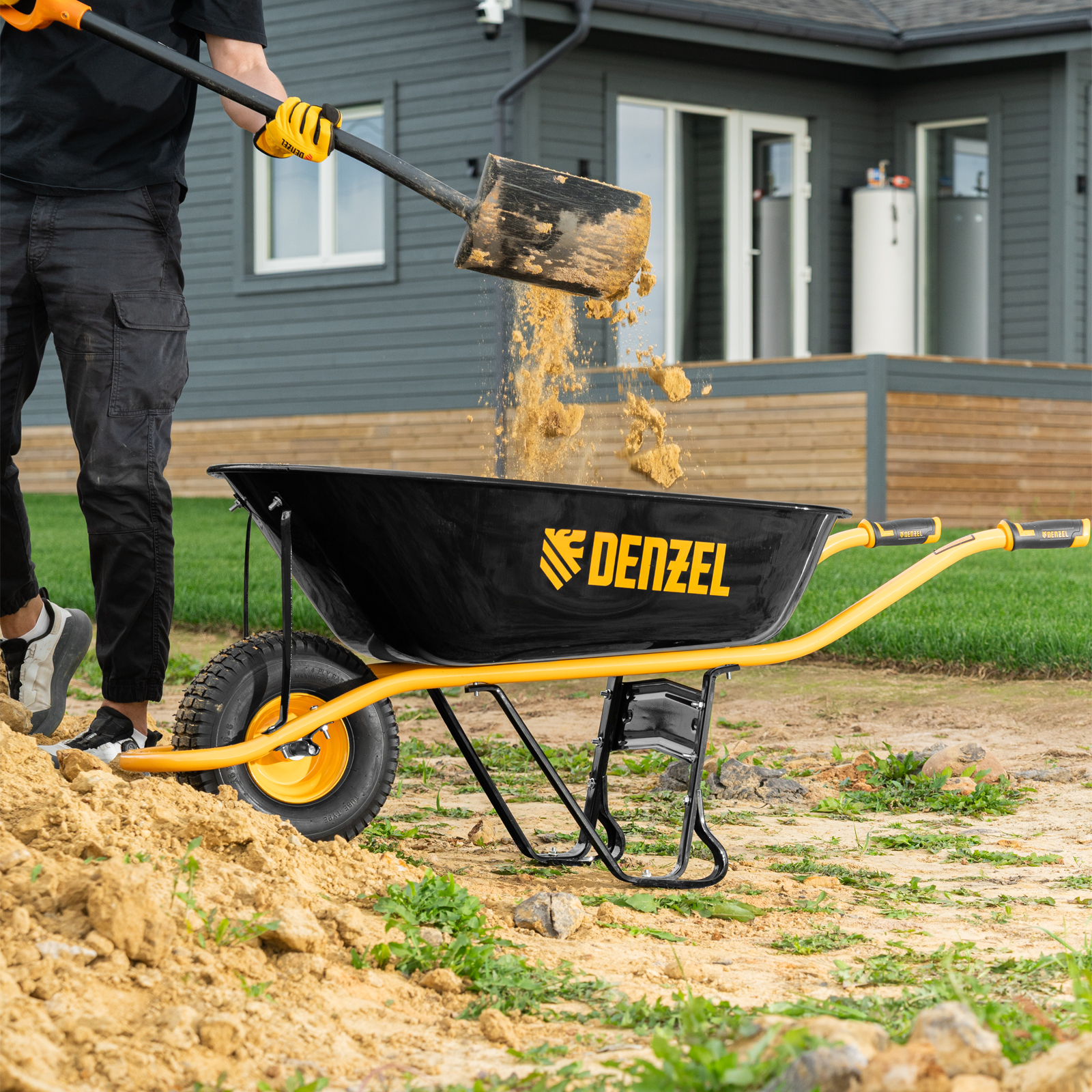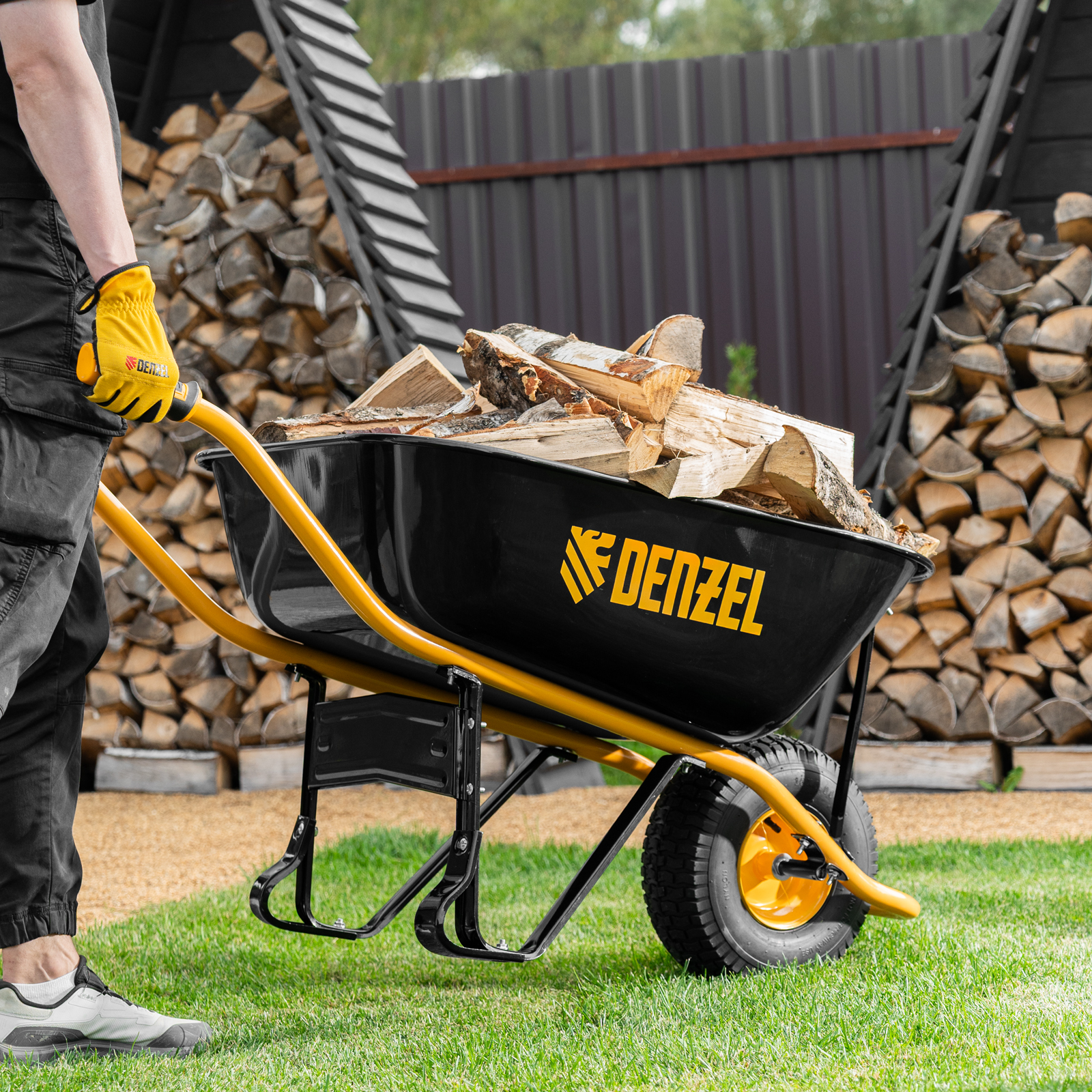 - Устойчивость — тачка не проваливается в грунт благодаря широкому пневматическому колесу и подпятникам на ножках.