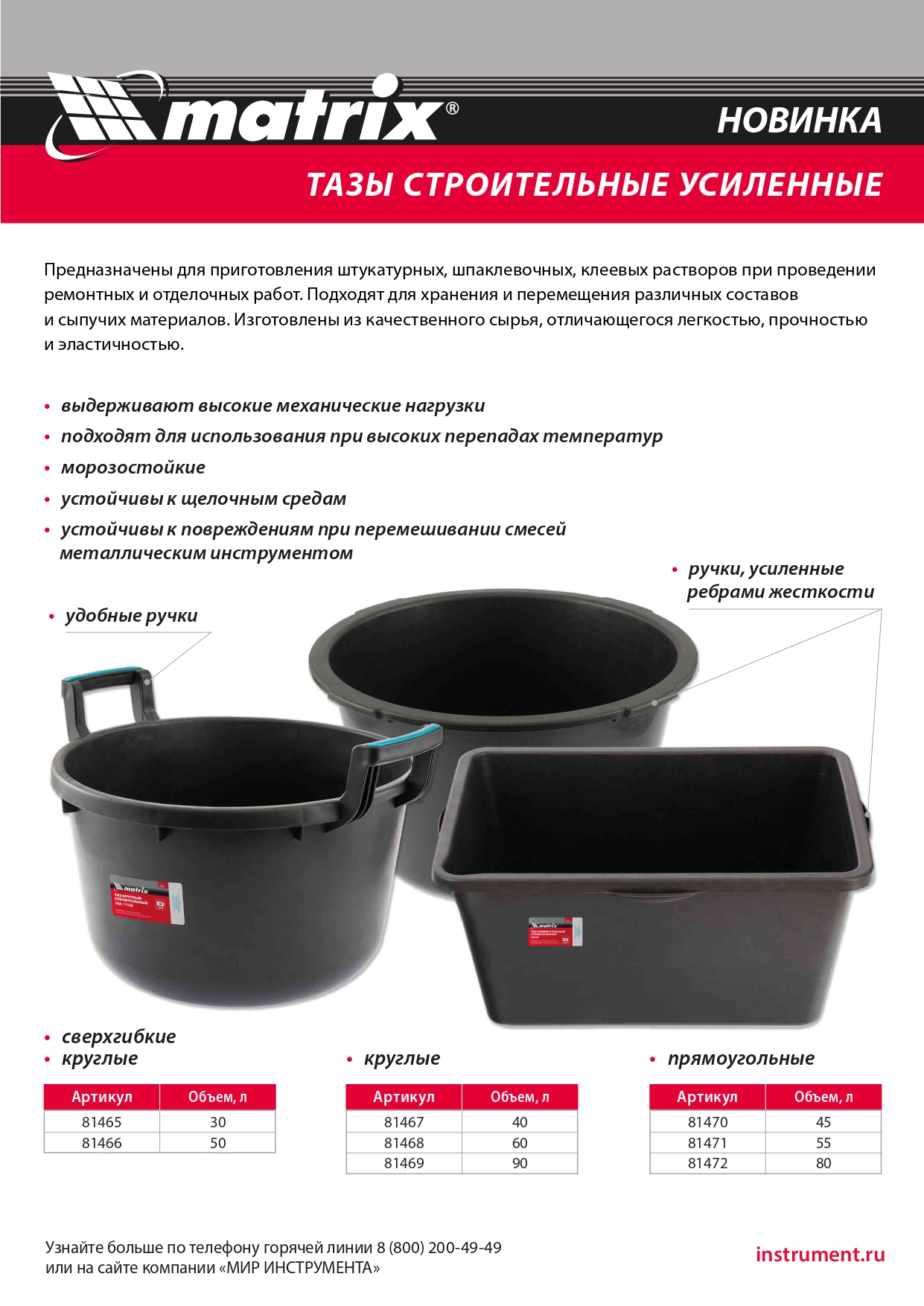 Таз круглый строительный гибкий Matrix 81465 объемом 30 л, с ручками, предназначен для замешивания строительных растворов любого типа при проведении ремонтно-отделочных работ. Благодаря диаметру 460 мм для приготовления смеси удобно использовать различный отделочный инструмент (шпатели, кисти). Пригодится такой таз и в быту: он удобен для хранения сыпучих материалов, сбора и утилизации мусора, проведения влажной уборки.