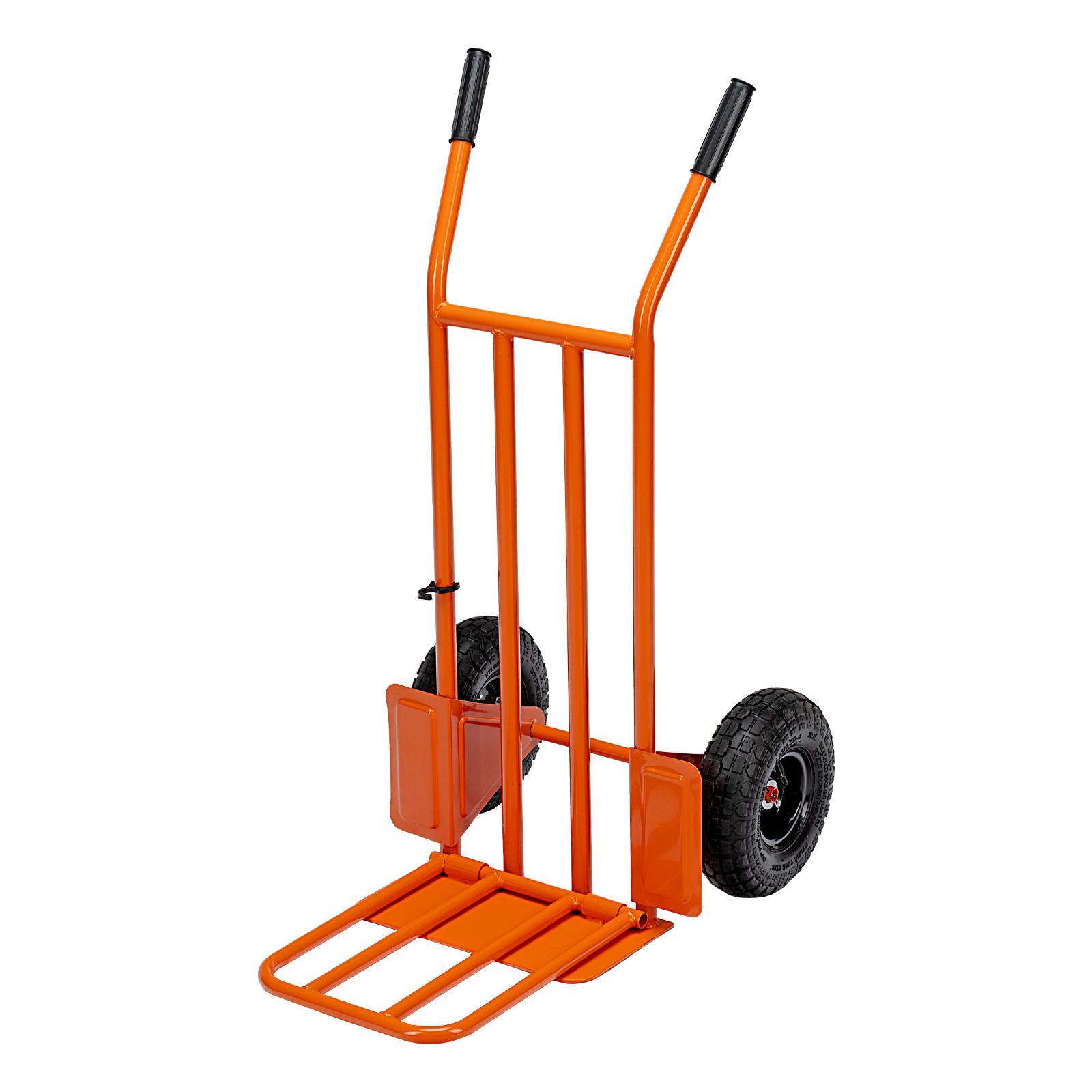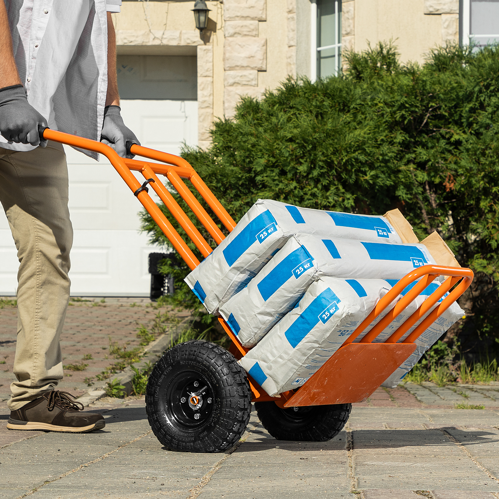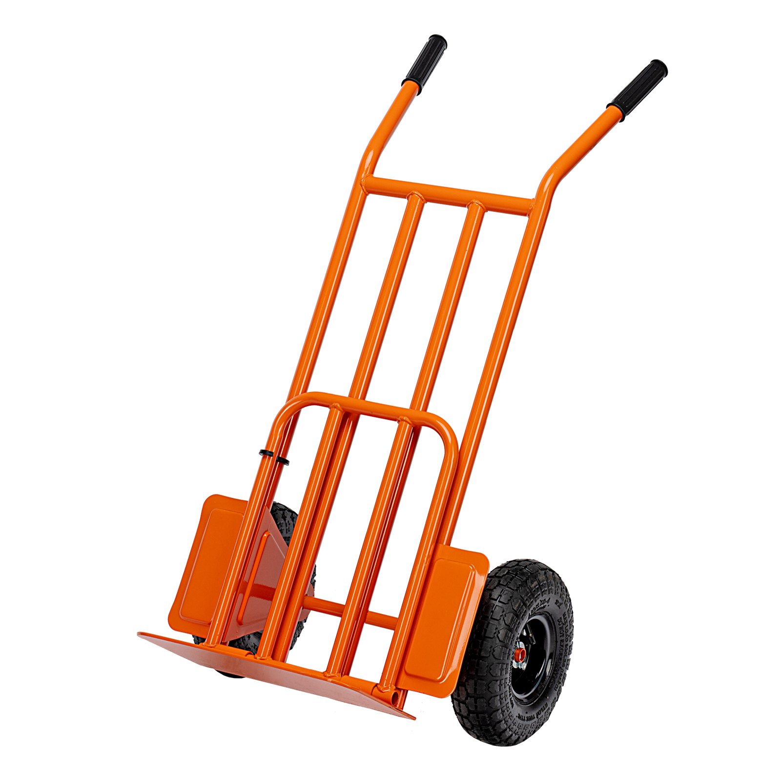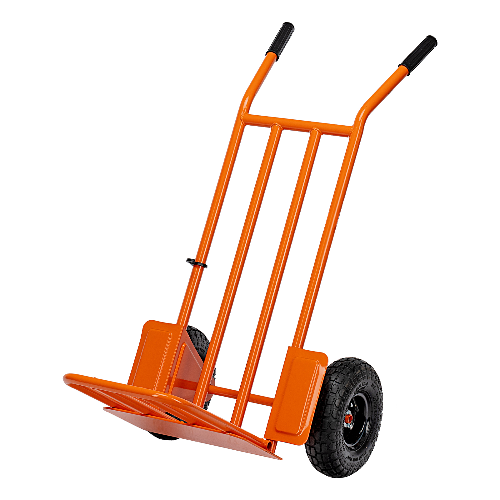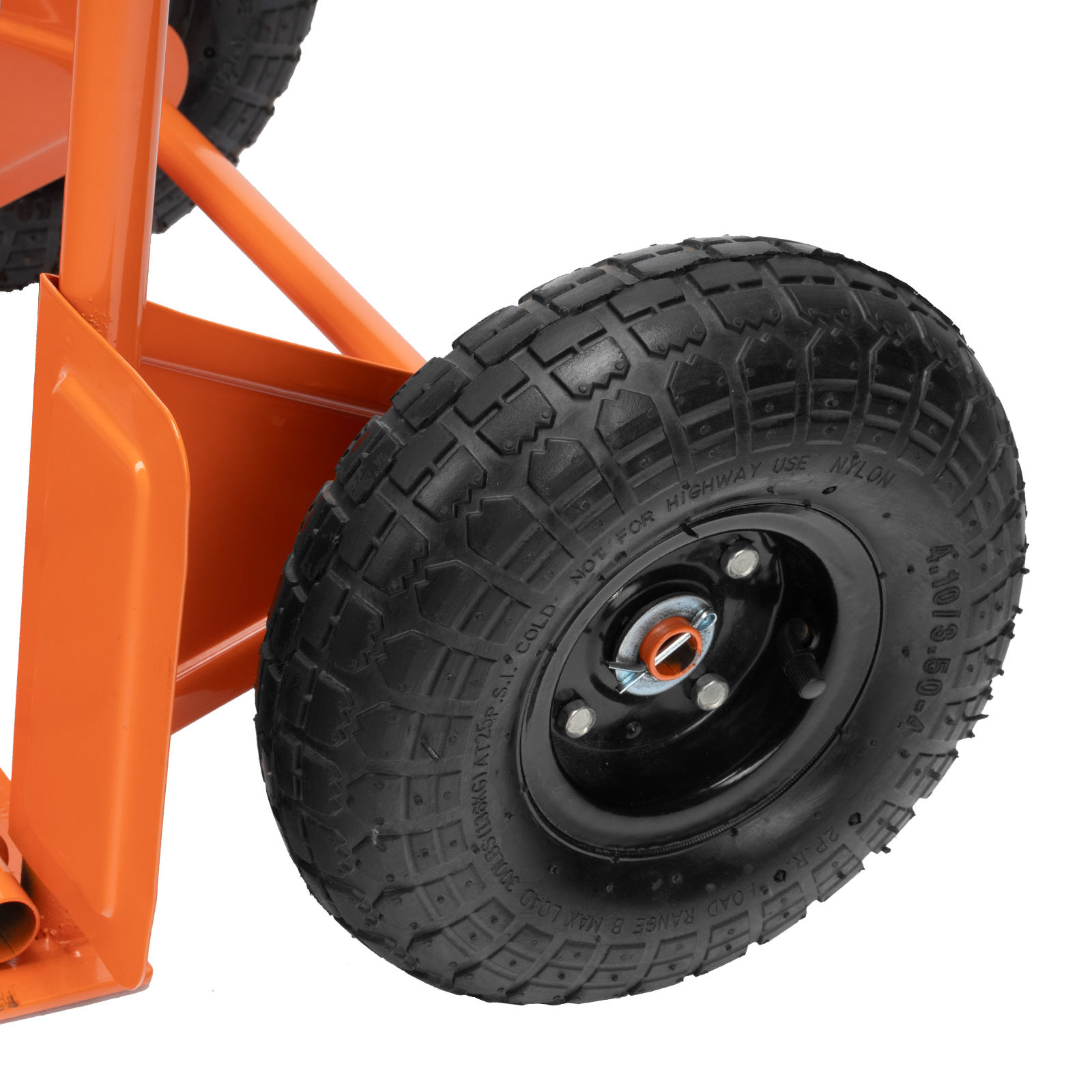 - Удобная транспортировка груза — пневматические колеса с камерами, резиновыми шинами и 2 шарикоподшипниками в каждом гасят вибрации и обеспечивают плавный ход.