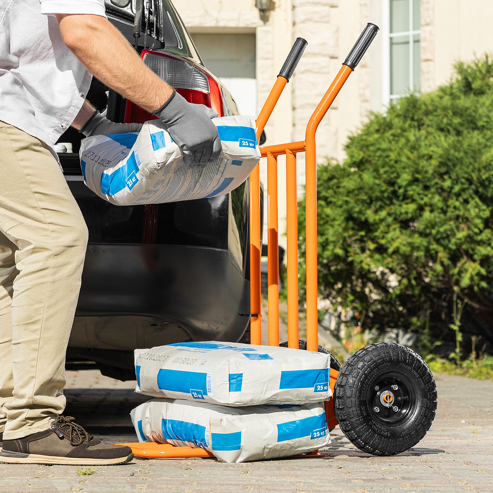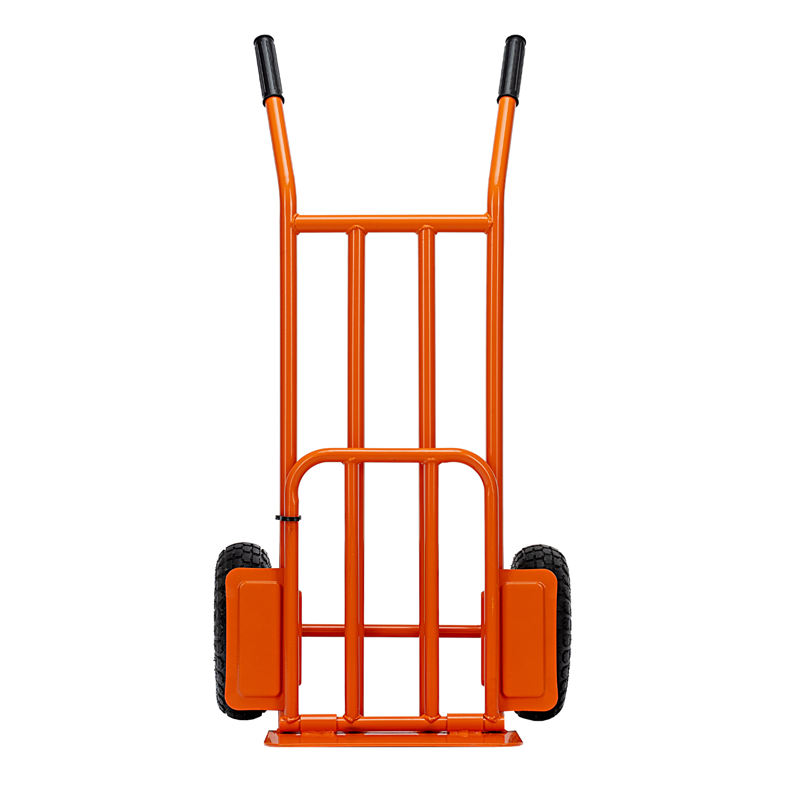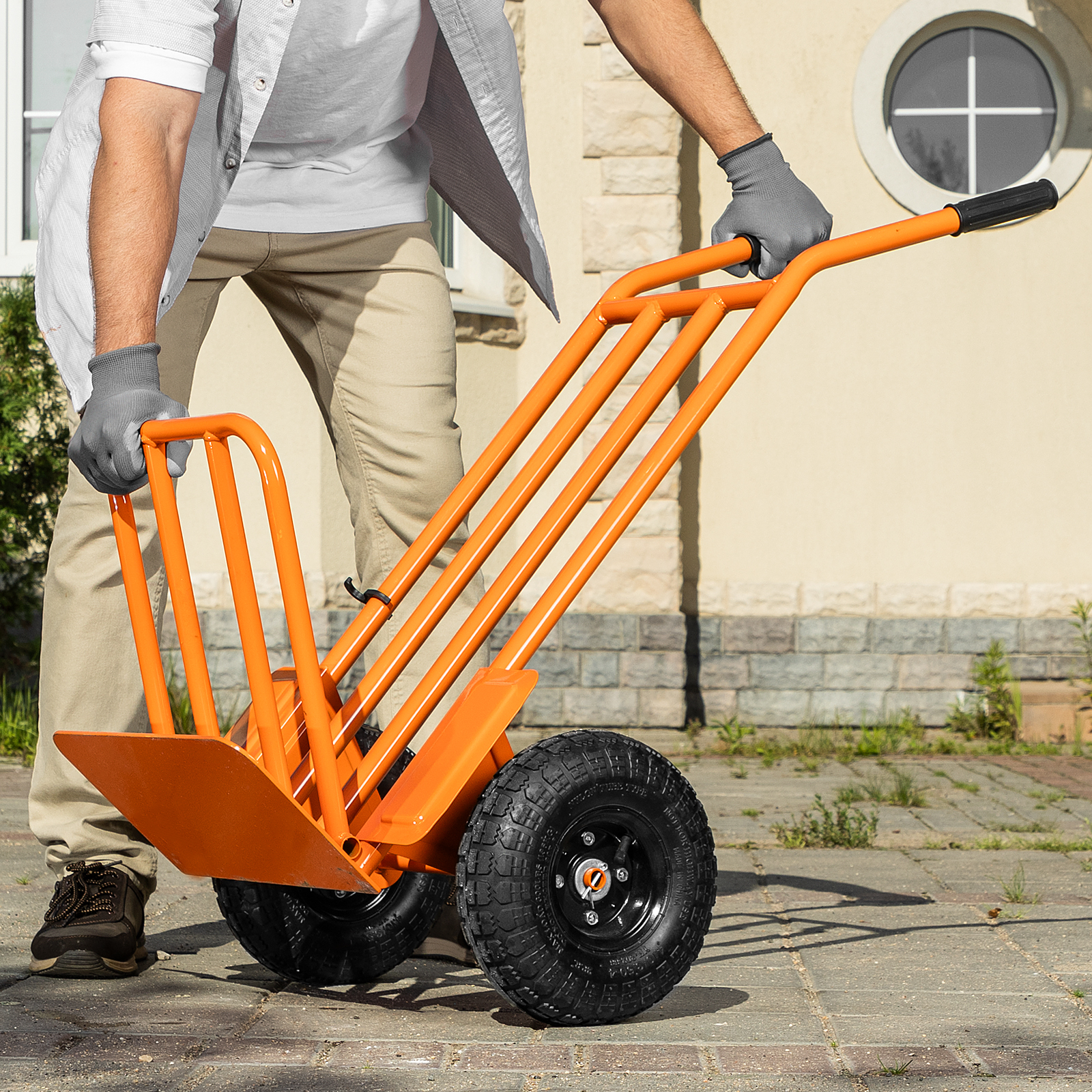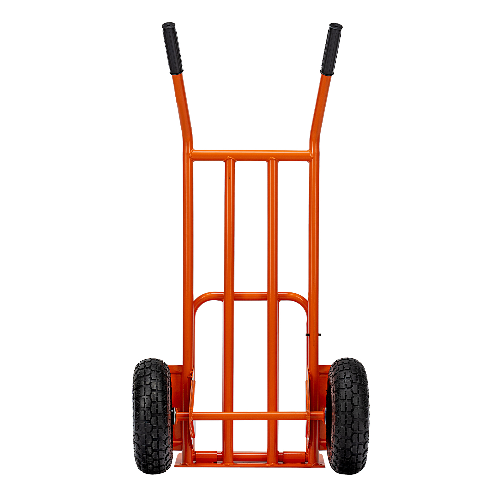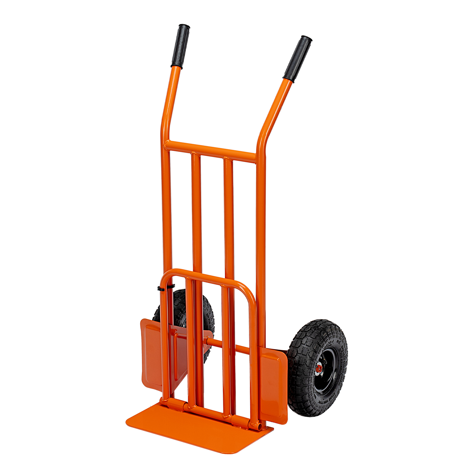 - Удобная транспортировка груза — пневматические колеса с камерами, резиновыми шинами и 2 шарикоподшипниками в каждом гасят вибрации и обеспечивают плавный ход.