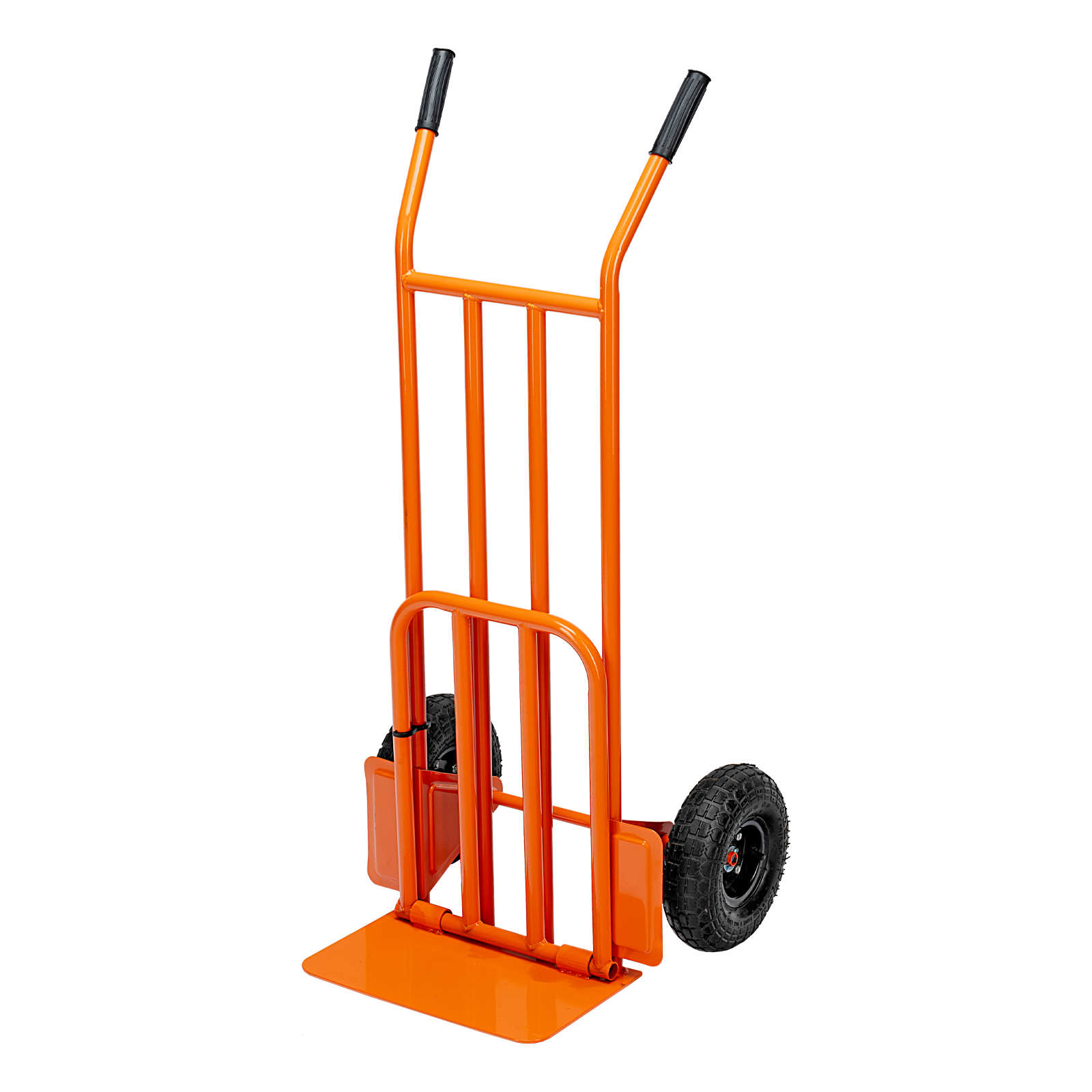 Ручная двухколесная тележка Сибртех 69302 с пневматическими колесами диаметром 260 мм и откидной платформой размером 530 х 400 мм имеет усиленную конструкцию и используется для перемещения крупных грузов массой до 250 кг. Пригодится на складе и на производстве.