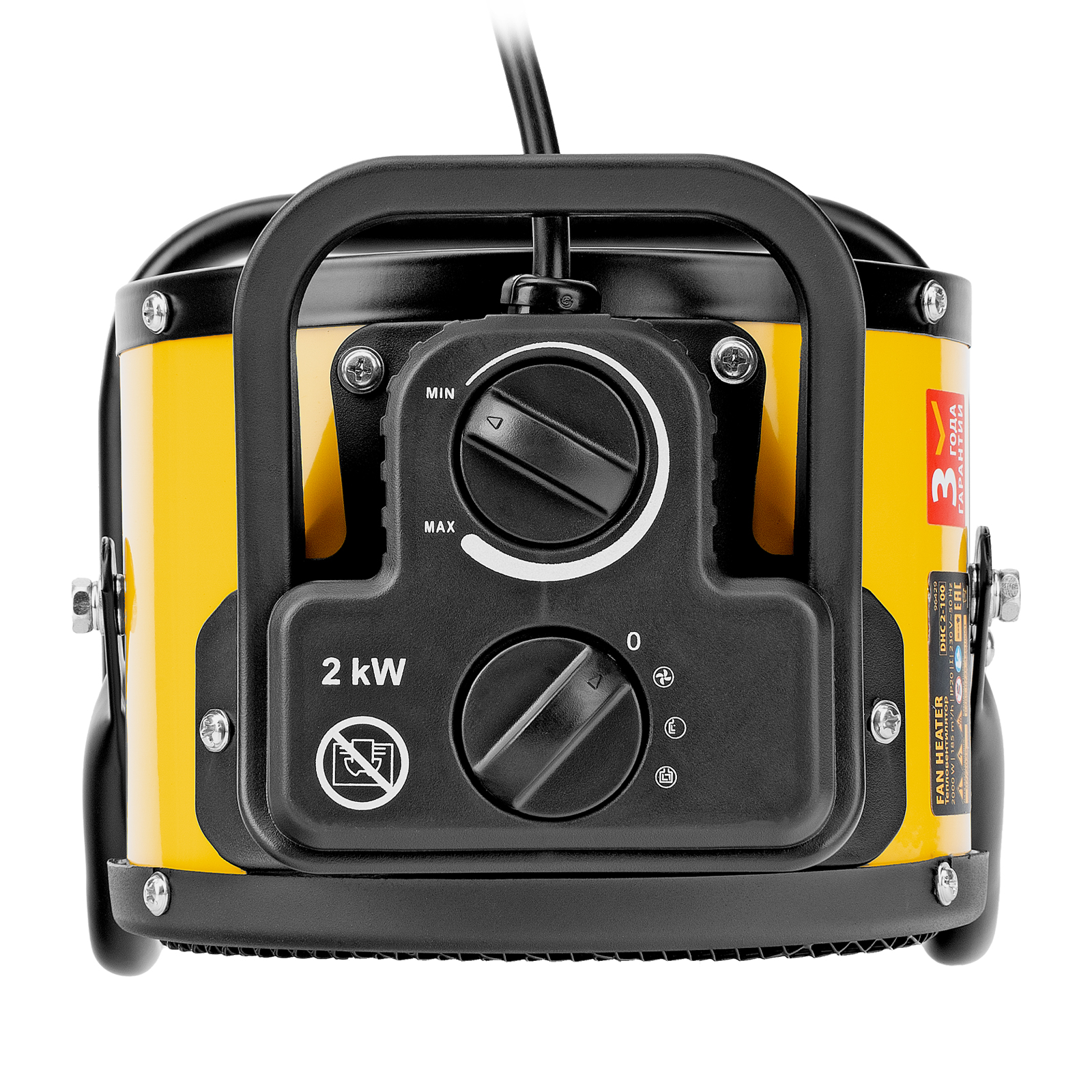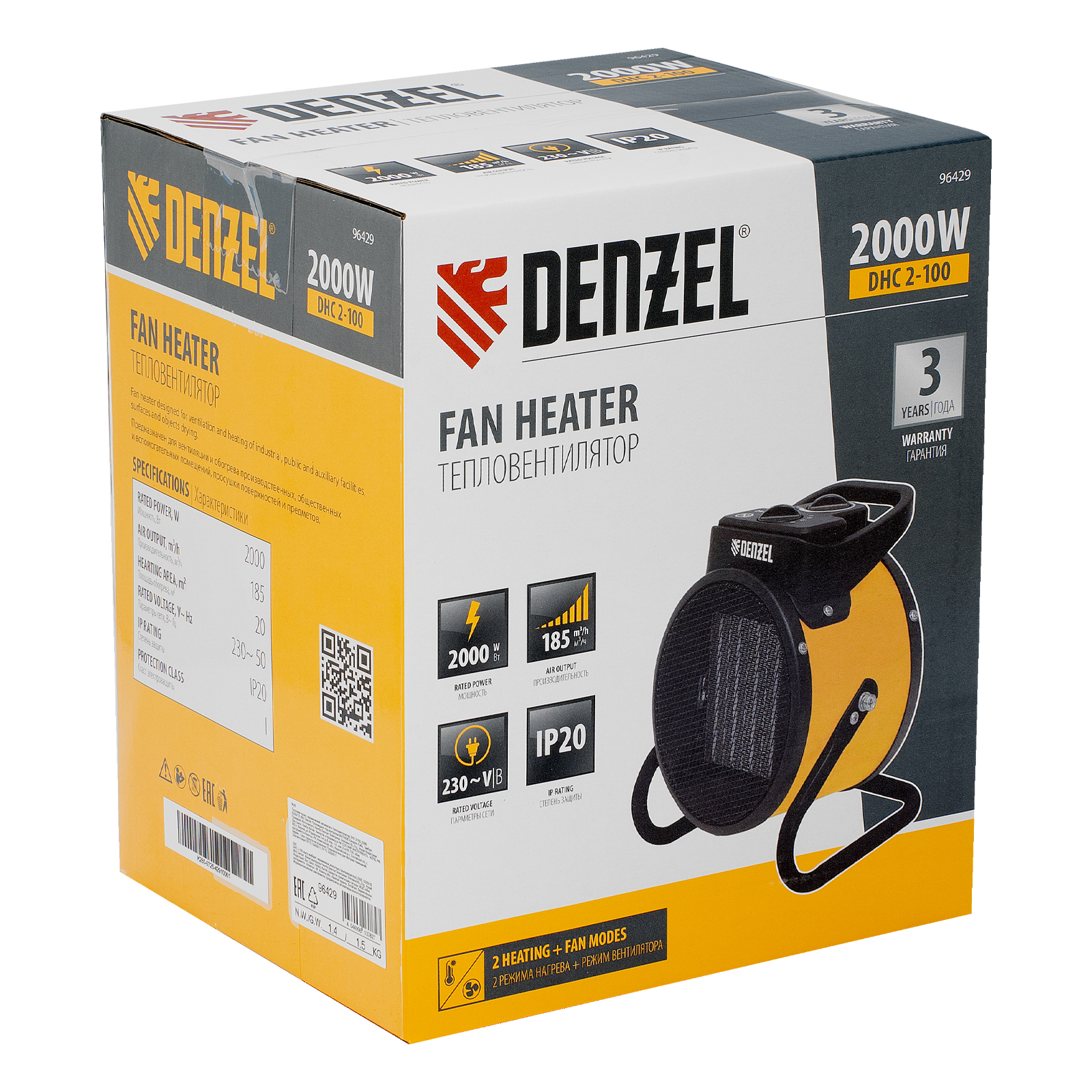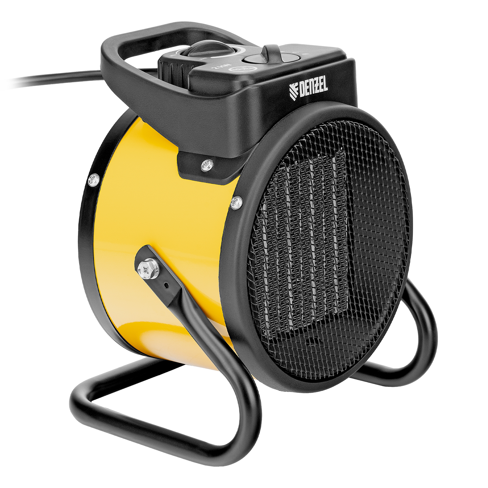 Тепловая пушка Denzel DHC 2-100 96429 работает на мощности 0,025, 1 или 2 кВт. Пригодится в любую погоду: в холод обогреет помещение, а в жару может использоваться в качестве вентилятора. Также тепловентилятор применяется для просушки поверхностей — окрашенных и оштукатуренных стен, стяжек. Максимальной мощности 2 кВт хватит для обогрева помещения площадью до 20 м². Работа пушки не доставляет дискомфорт, безопасна для здоровья людей и животных, поскольку керамический нагревательный элемент не сушит воздух и не выделяет вредных веществ.