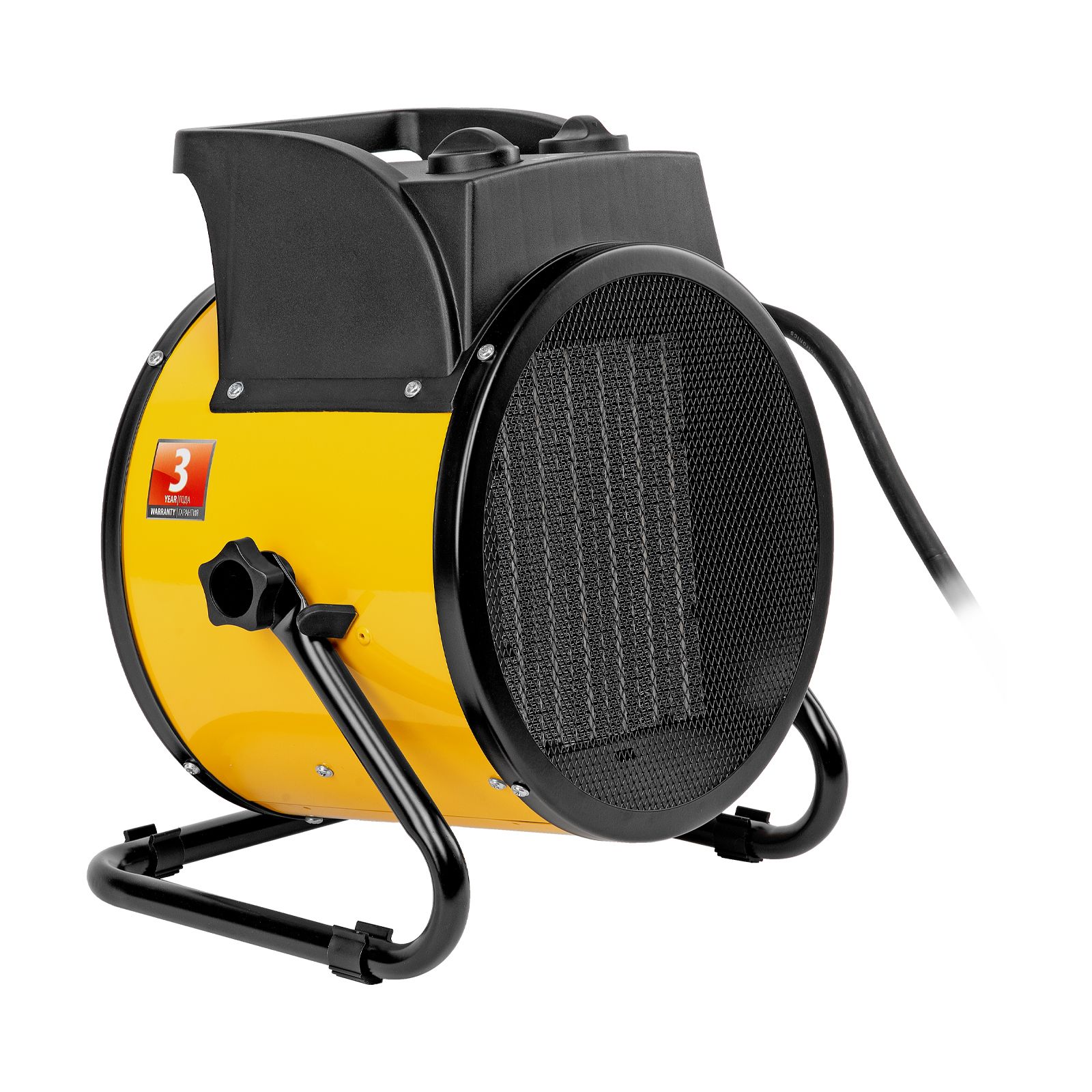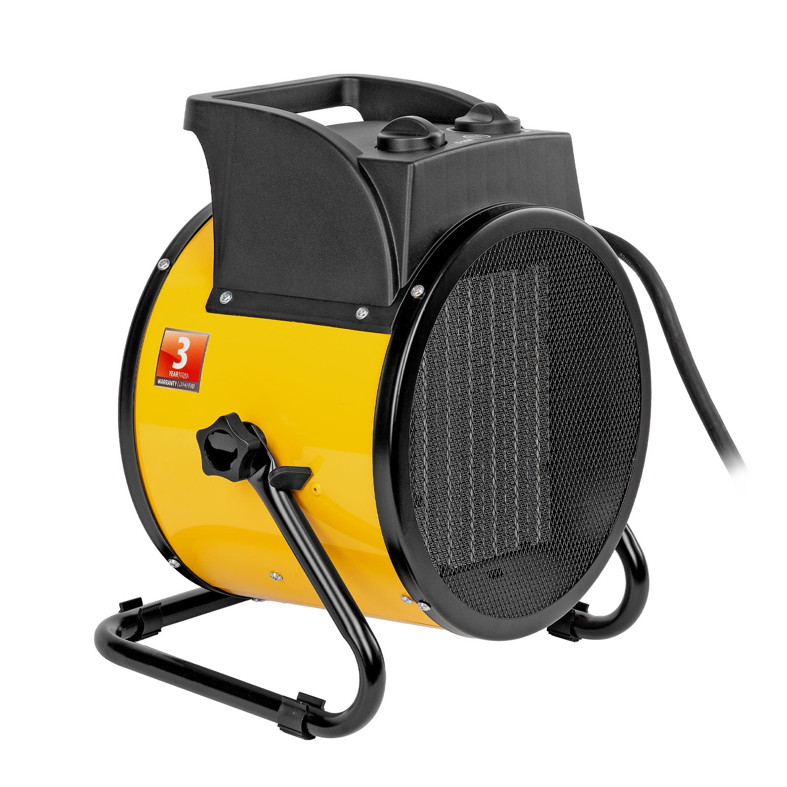 Тепловая пушка (тепловентилятор) Denzel DHC 5-400 96428 с керамическим нагревательным элементом работает на мощности 0,04/3/5 кВт. Пригодится в любую погоду: в холод обогреет помещение, в теплое время года может использоваться как вентилятор. Также пушка применяется во время отделочных работ для просушки поверхностей — окрашенных и оштукатуренных стен, стяжек и т.д. Максимальной мощности 5 кВт хватит для обогрева помещения площадью до 50 кв.м. Работа тепловентилятора не доставляет дискомфорт, безопасна для здоровья людей и животных, поскольку керамический нагревательный элемент не сушит воздух и не выделяет вредных веществ.,Внимание! Тепловая пушка поставляется с установленным кабелем питания и силовой вилкой 230 В / 32 А, для подключения используется силовая розетка 230 В / 32 А (обычные бытовые розетки не рассчитаны на мощность 5 кВт).
