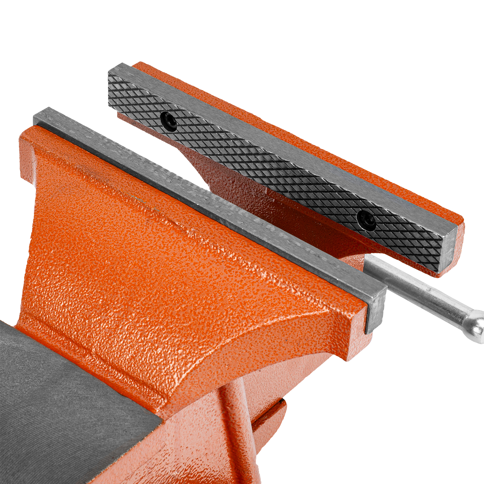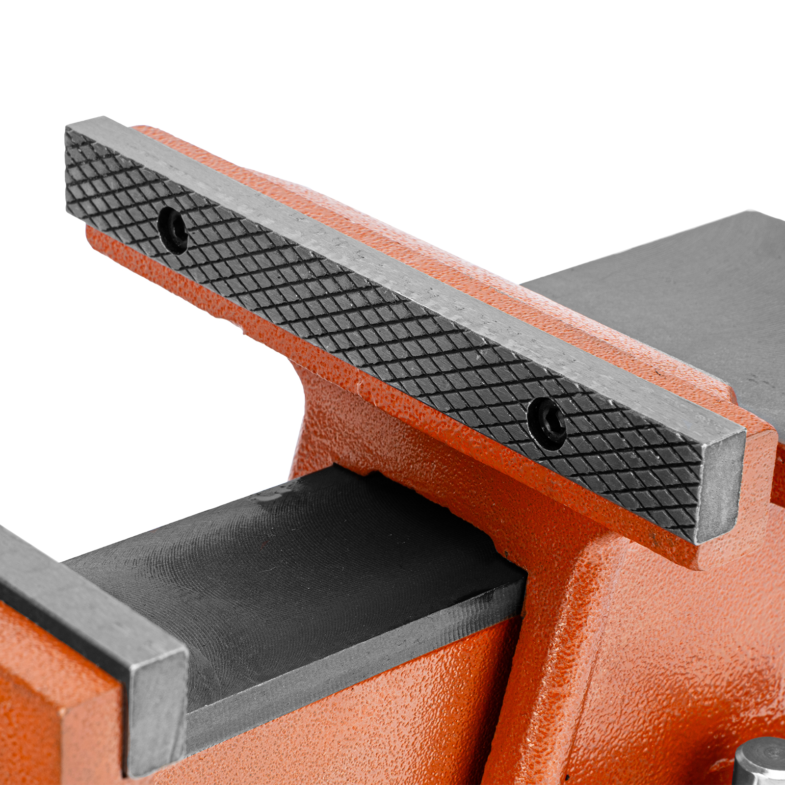 - Корпус тисков выполнен из чугуна, а губки — из стали, благодаря чему достигается высокая прочность инструмента.