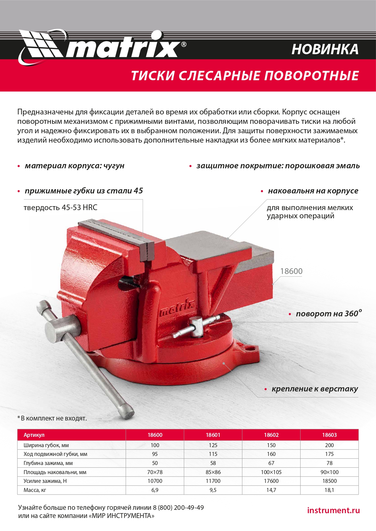 Поворотные слесарные тиски Matrix 18603 с наковальней и губками шириной 200 мм имеют рабочий ход 175 мм и предназначены для захвата и фиксации различных деталей. Поворотный механизм с прижимными винтами позволяет вращать тиски на 360° и фиксировать их в выбранном положении для удобной обработки заготовок с разных сторон. Инструмент используется для шлифовки, сверления и проведения других работ. Будет полезен в мастерской и гараже.