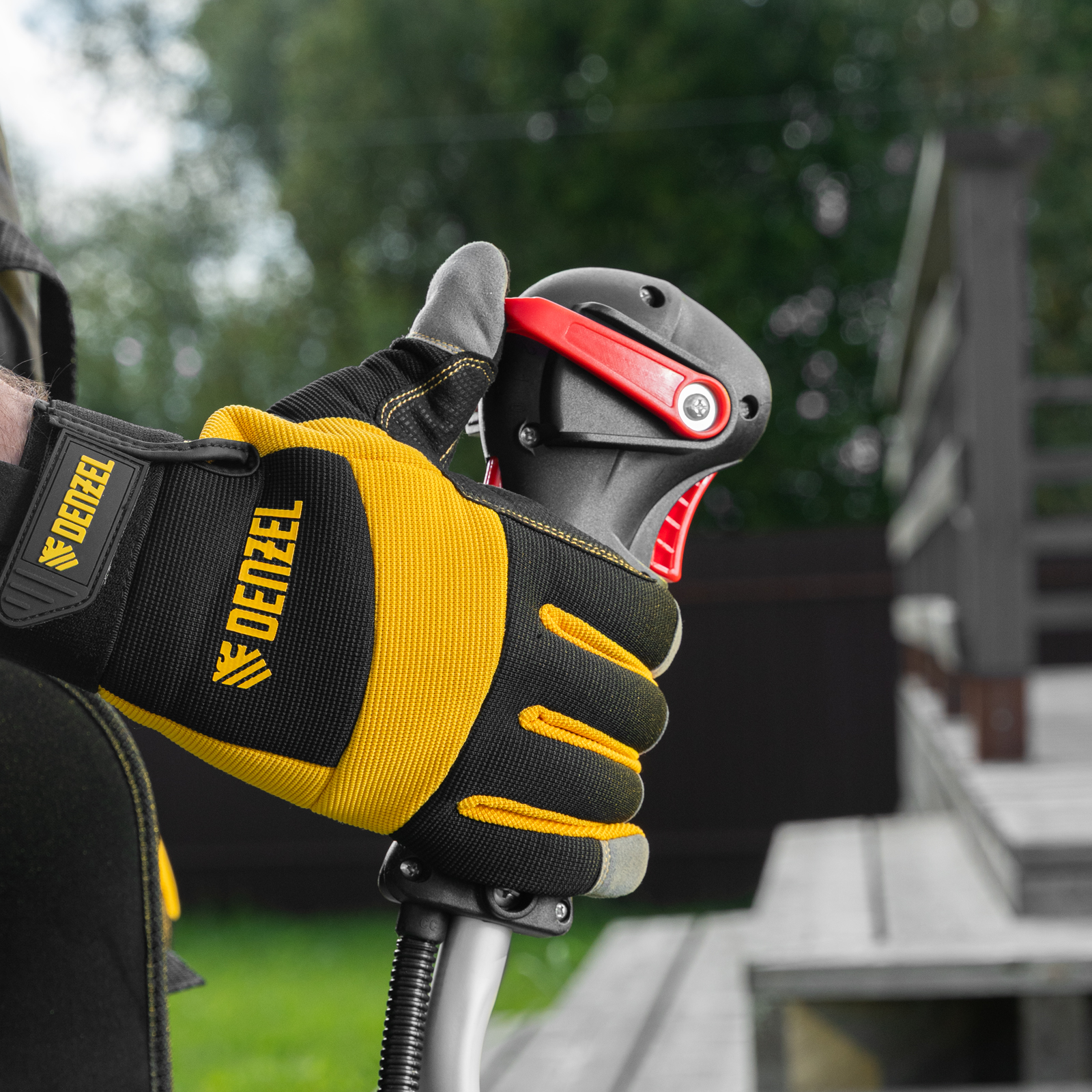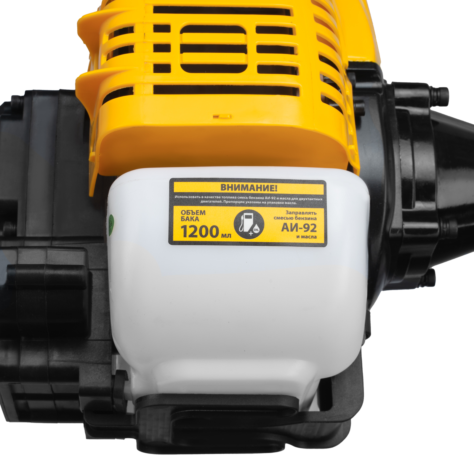 Бензиновый триммер Denzel DT-52E 962025 с двигателем объемом 52 куб. см, с неразъемной штангой и электростартером, поставляется комплектом из 2 частей и используется для ухода за дачным участком. С его помощью можно подравнять газон, скосить траву любого типа, в том числе с жесткими древовидными стеблями (полынь, крапива, лебеда, борщевик), а также срезать кустарник и молодые побеги деревьев с диаметром стволов до 10 мм. Триммер успешно справляется с этими задачами благодаря входящим в комплект катушке с леской и пильному диску с шириной скашивания 42 и 25,5 см соответственно. На штангу уже установлен редуктор и корпус сцепления, что упрощает подготовку инструмента к работе.