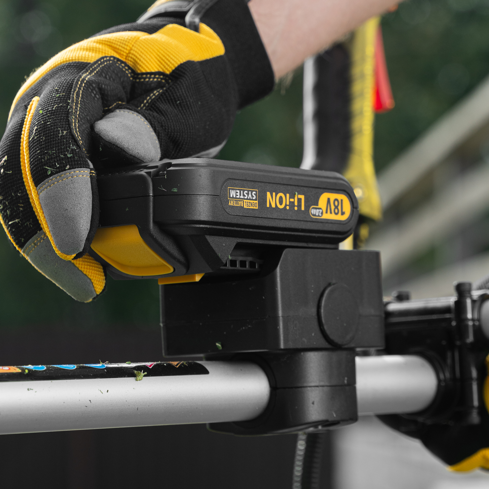 - Максимально комфортная работа — благодаря плечевому ремню триммер удобно удерживать, а мягкая пластина предохраняет пользователя от вибраций и ударов штангой по бедру.