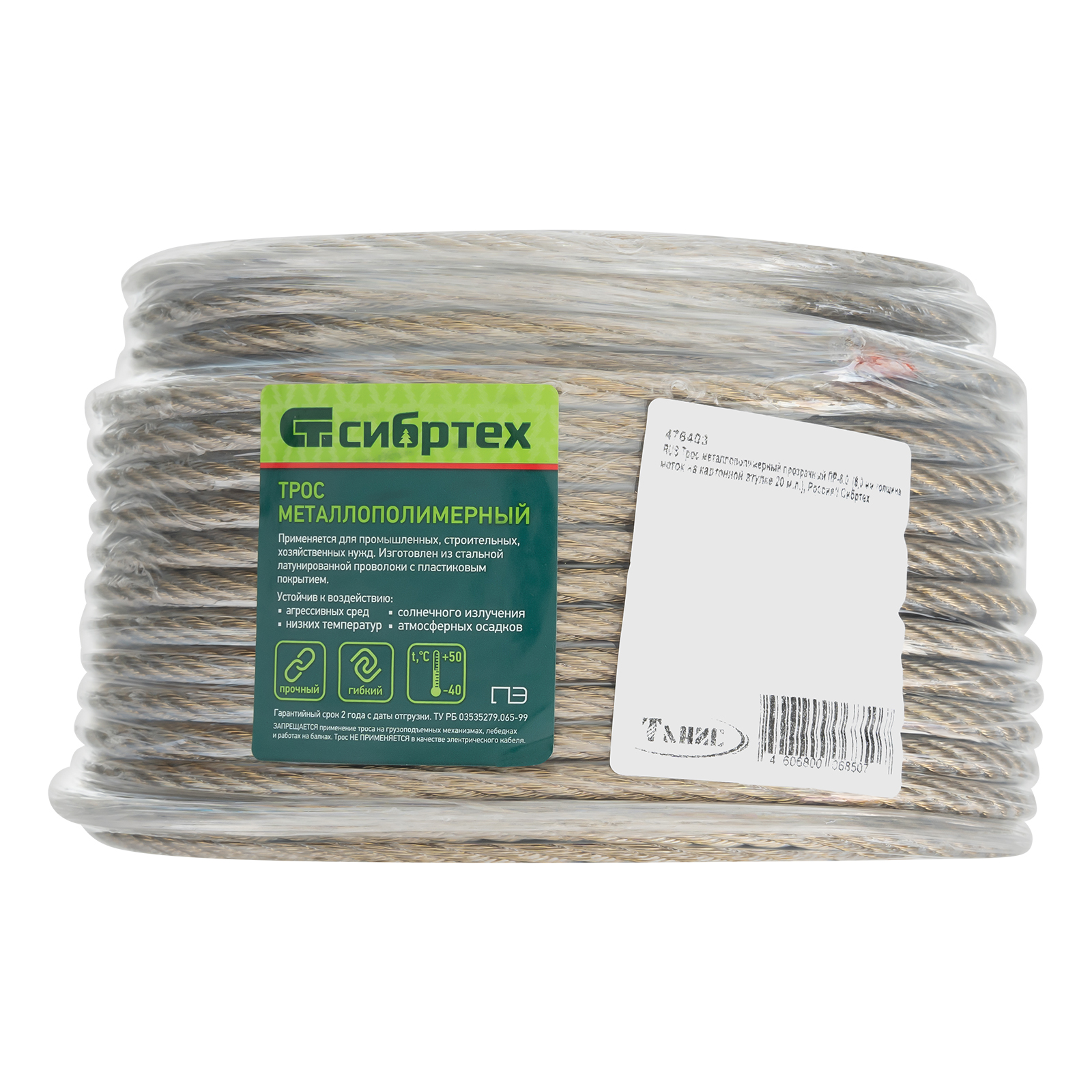 Трос металлополимерный прозрачный ПР-6.0, толщина 6.0 мм, моток 20 метров Сибртех