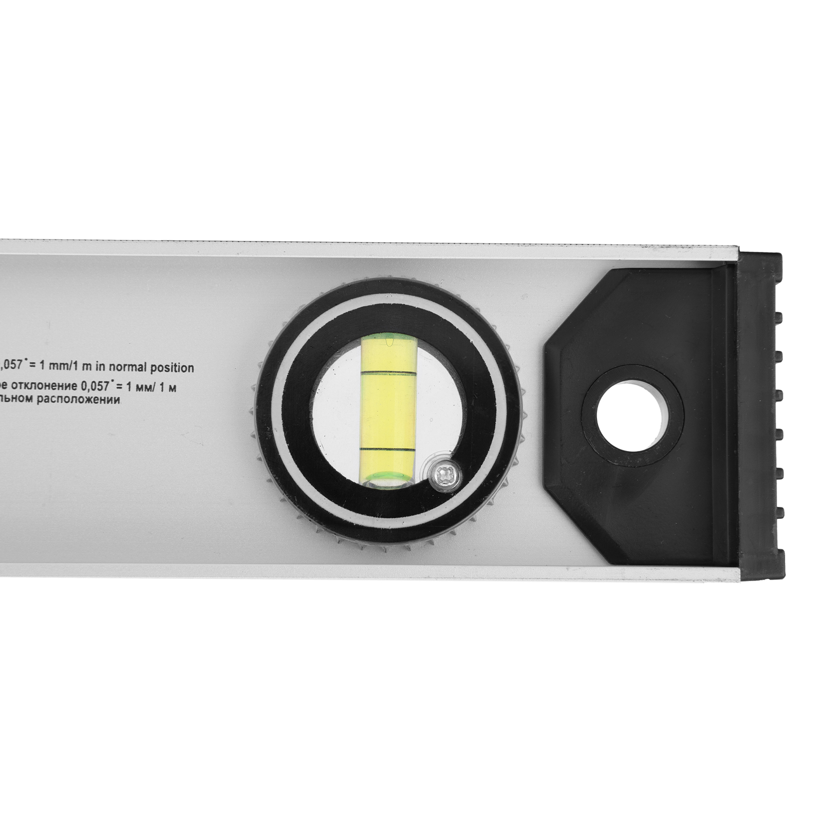 Алюминиевый уровень Matrix «Рельс» 34029 длиной 1000 мм имеет 3 глазка: 2 для проверки отклонений от заданной вертикали и горизонтали и 1 поворотный для проверки наклонных поверхностей.