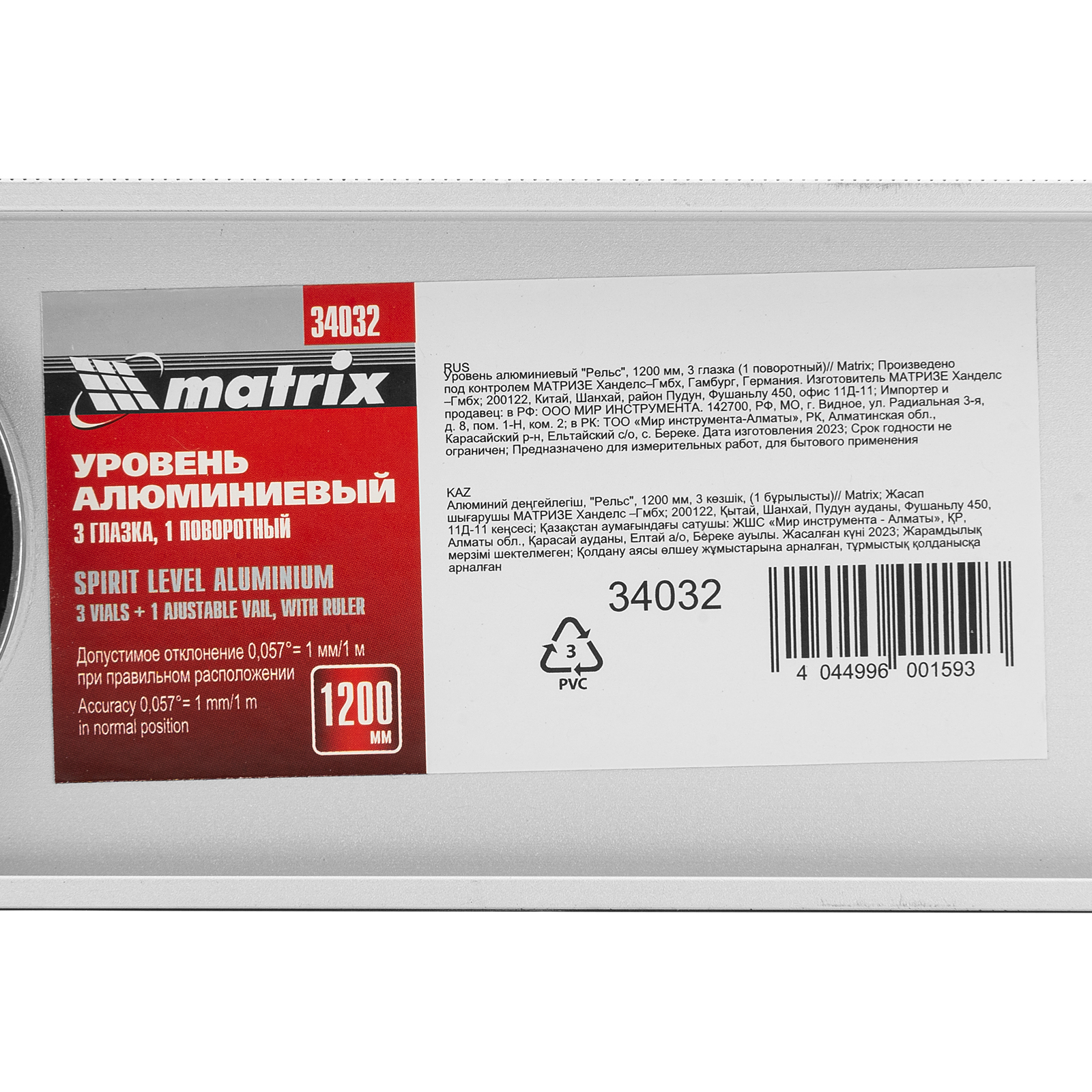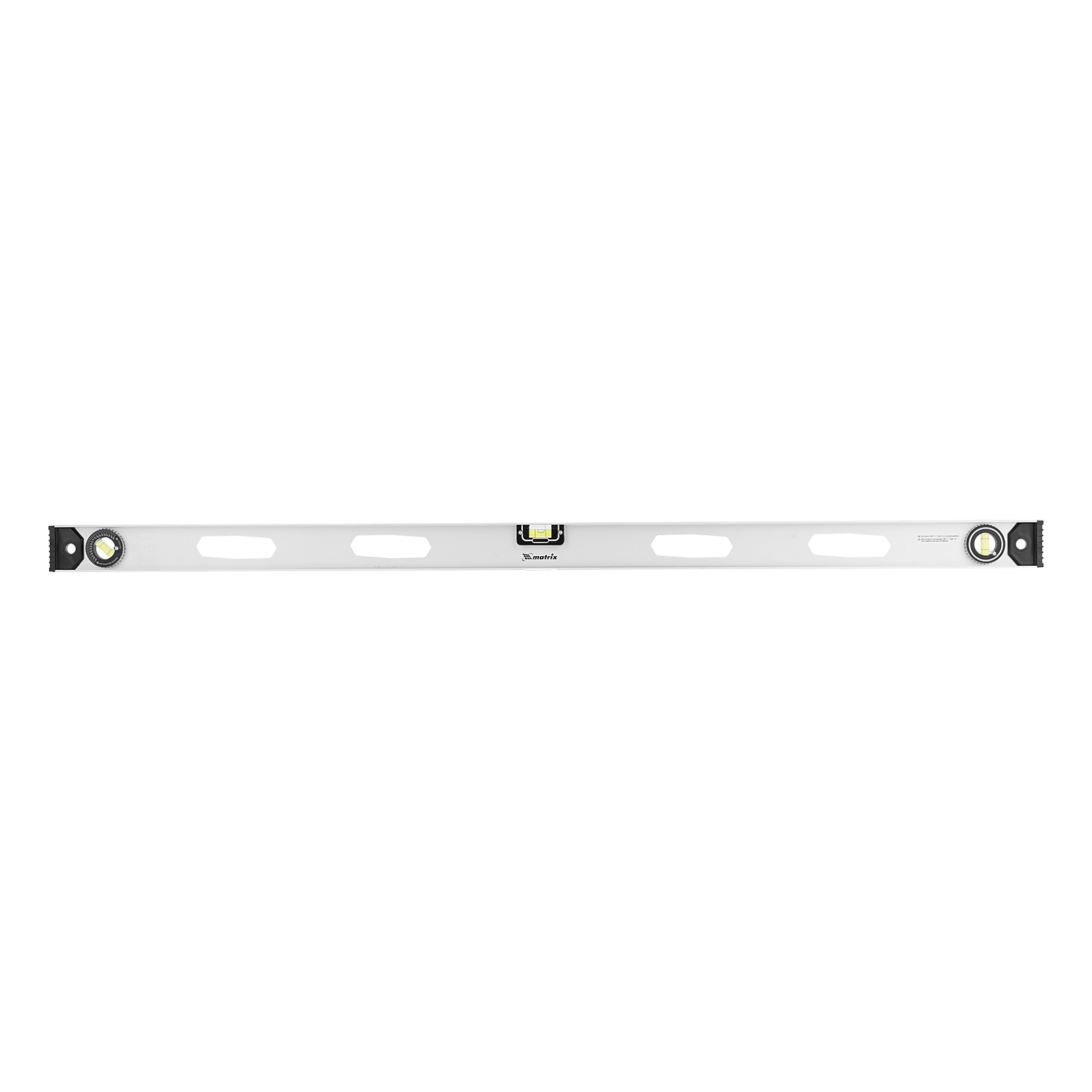 Алюминиевый уровень Matrix «Рельс» 34032 длиной 1200 мм имеет 3 глазка: 2 для проверки отклонений от заданной вертикали и горизонтали и 1 поворотный для проверки наклонных поверхностей.