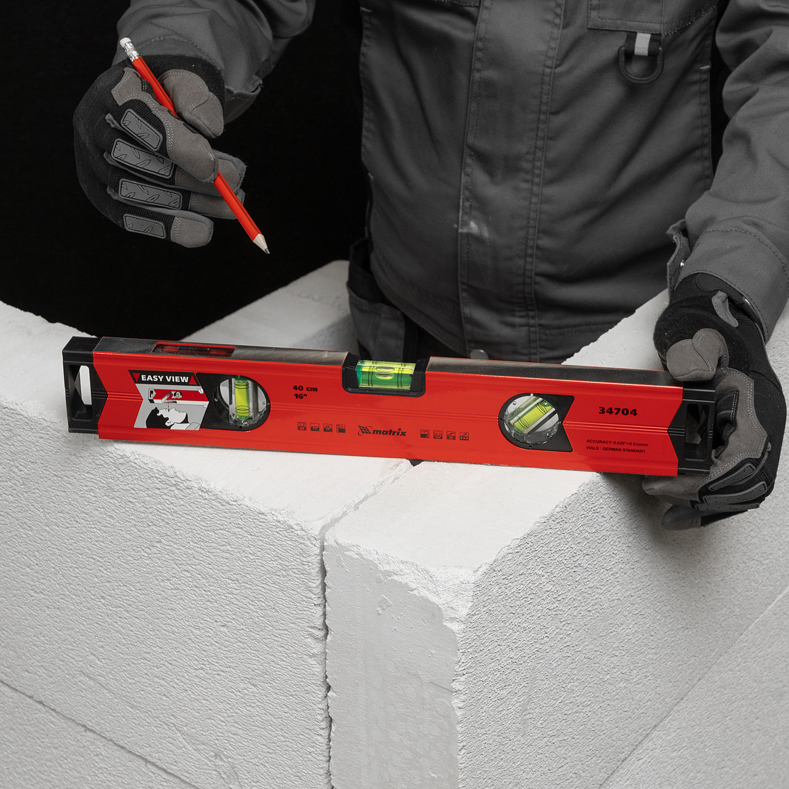 Алюминиевый магнитный уровень Matrix 34704 длиной 400 мм, усиленный, оснащен 3 глазками и одним зеркальным отражателем. С его помощью можно выявить отклонения от вертикали, горизонтали и угла 45 градусов. Встроенный зеркальный глазок повышает удобство работы, позволяя легко считывать показания.,Для определения отклонения вертикали 90 градусов необходимо использовать пузырьковую ампулу только в верхнем положении уровня. Только базовая поверхность является рабочей (противоположная ампуле 180 градусов).