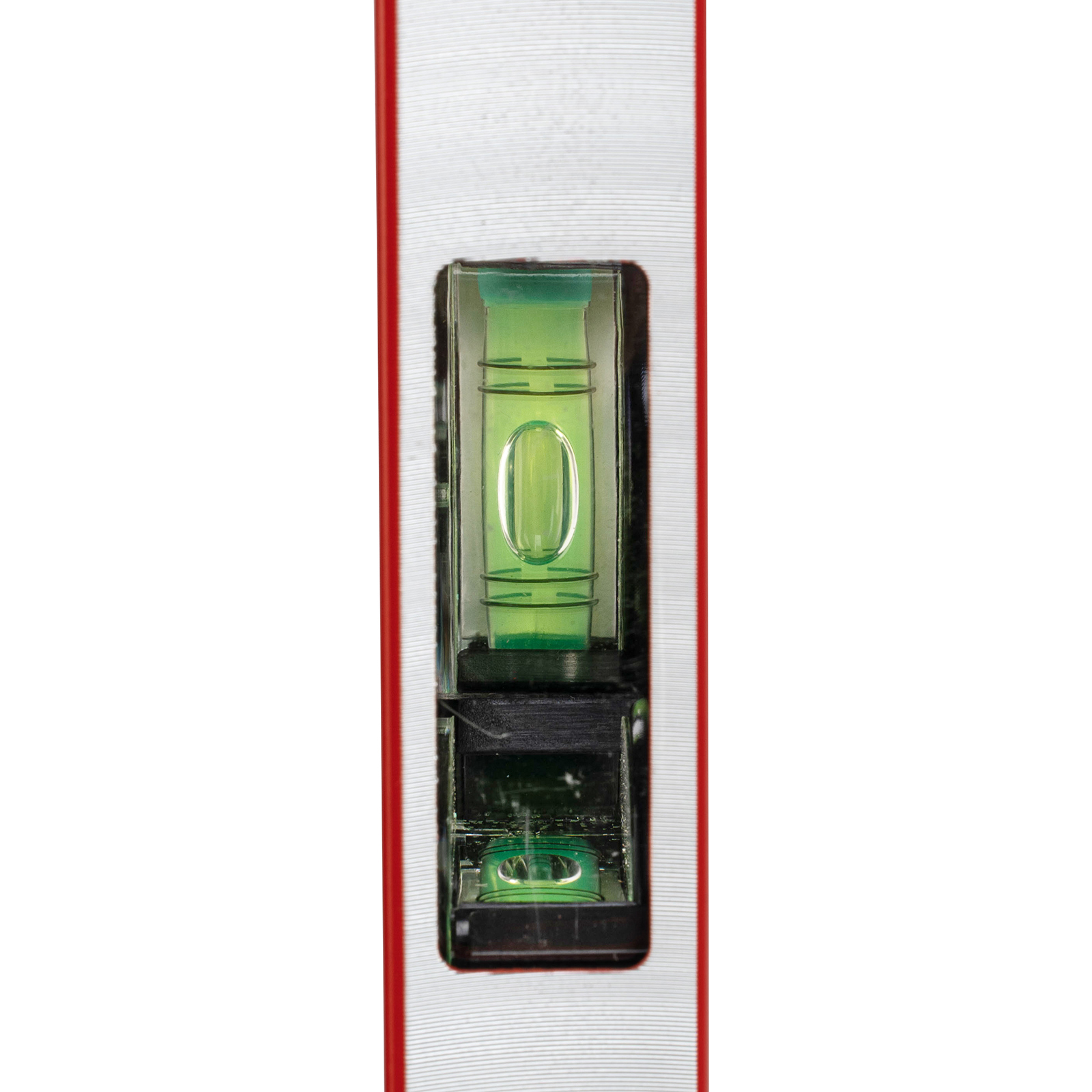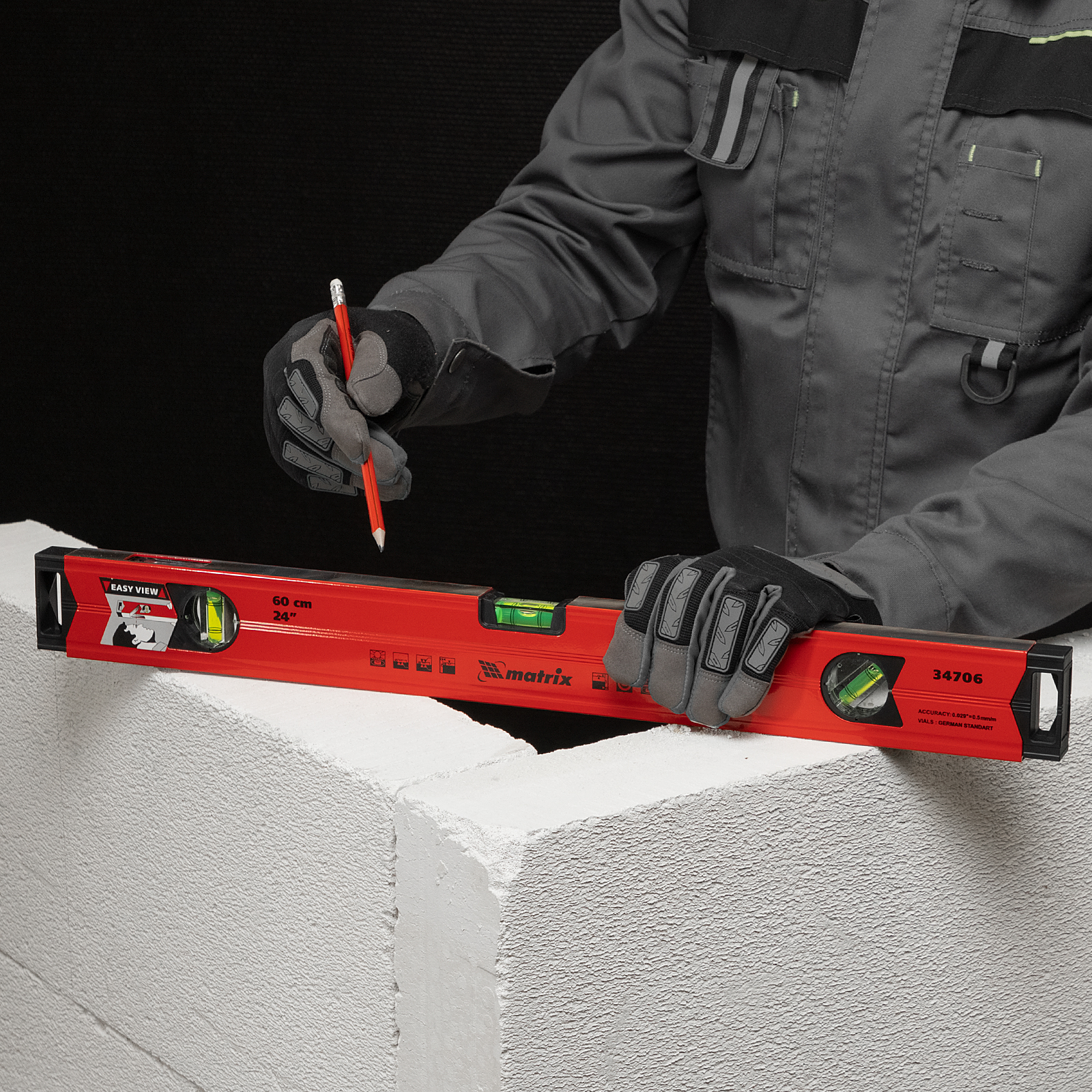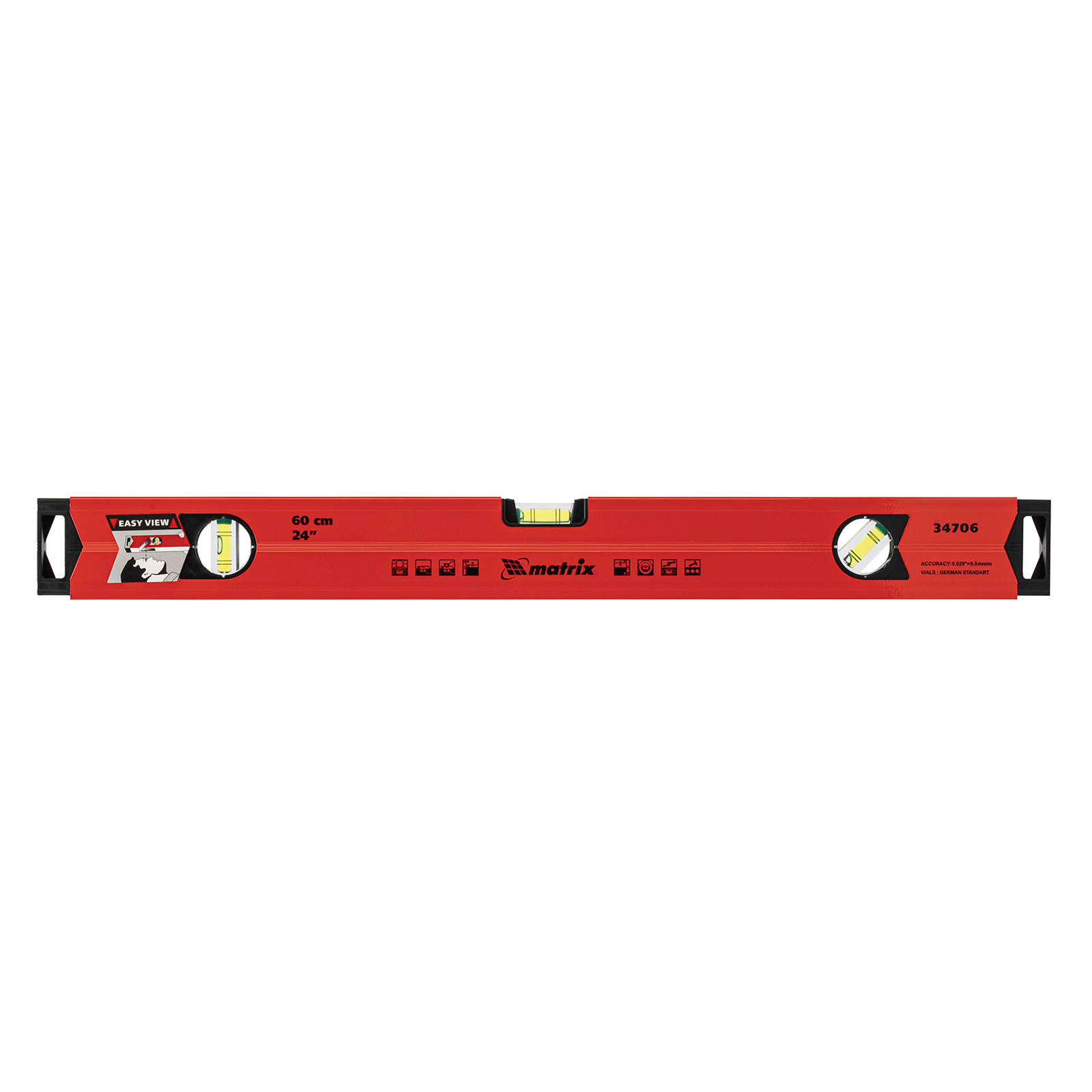 Алюминиевый магнитный уровень Matrix 34706 длиной 600 мм, усиленный, оснащен 3 глазками и одним зеркальным отражателем. С его помощью можно выявить отклонения от вертикали, горизонтали и угла 45 градусов. Встроенный зеркальный глазок повышает удобство работы, позволяя легко считывать показания.,Для определения отклонения вертикали 90 градусов необходимо использовать пузырьковую ампулу только в верхнем положении уровня. Только базовая поверхность является рабочей (противоположная ампуле 180 градусов).