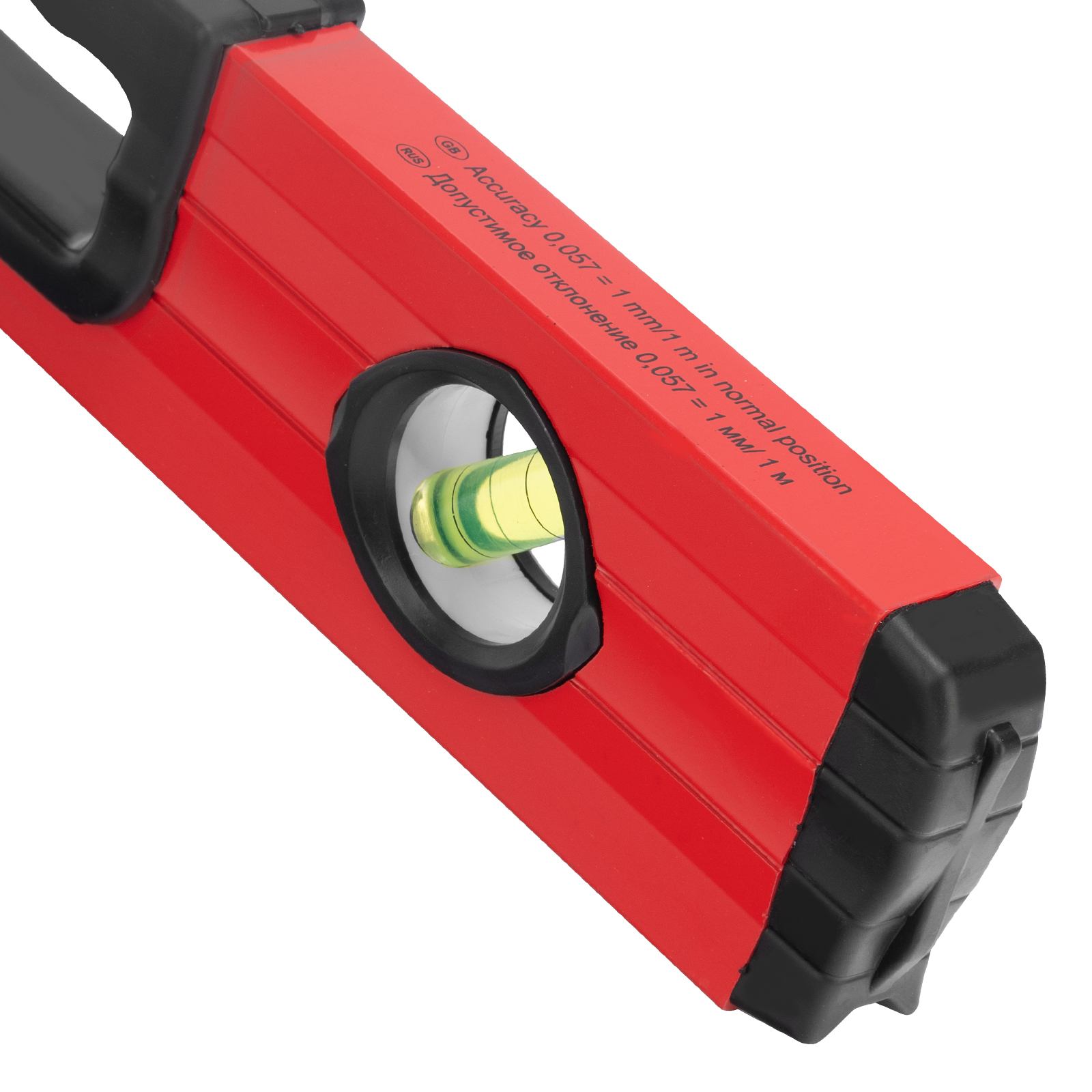 Фрезерованный алюминиевый уровень Matrix 33221 длиной 600 мм, с 3 глазками и 2 эргономичными ручками, поможет проверить горизонтальные и вертикальные поверхности, выставить угол 45 градусов. Он будет полезен на любом этапе строительства и ремонта: при облицовке и отделке поверхностей, монтаже конструкций и т.д. Погрешность измерений на метр не превышает 1 мм (0,057 градуса).,Для определения отклонения вертикали 90 градусов необходимо использовать пузырьковую ампулу только в верхнем положении уровня. Только базовая поверхность является рабочей (противоположная ампуле 180 градусов).