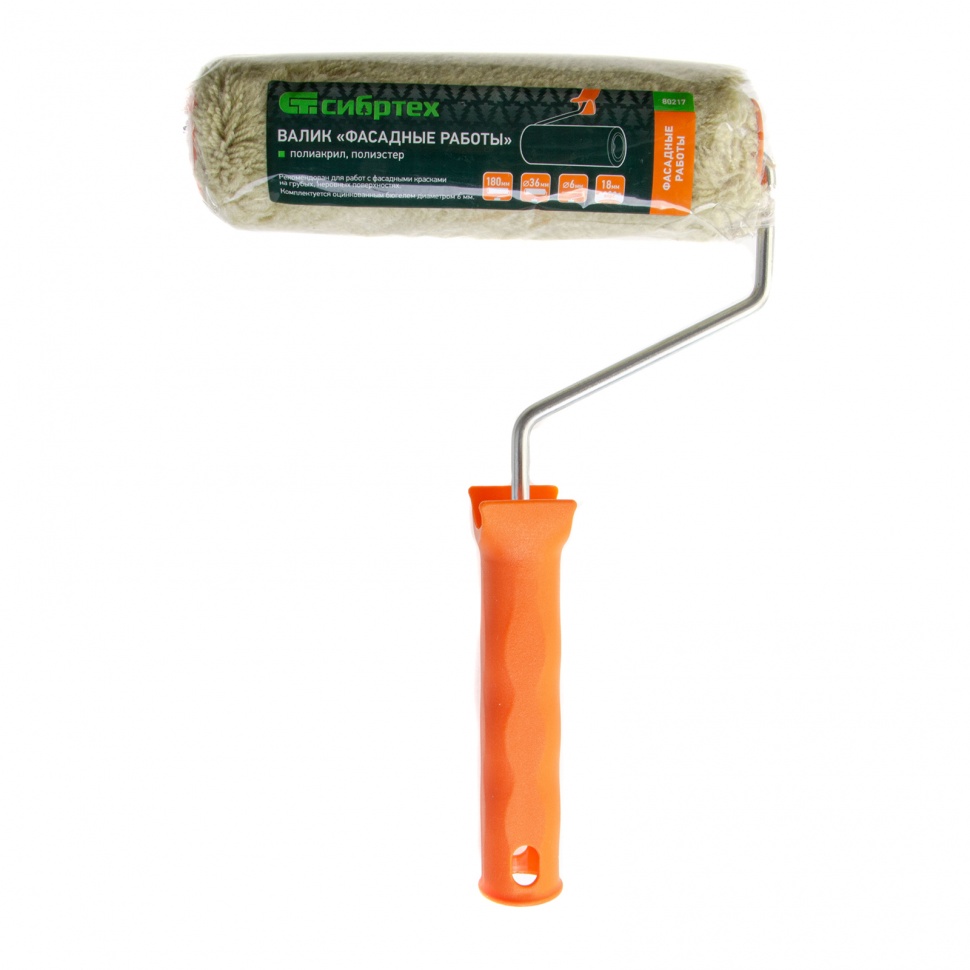 Валик Сибртех «Фасадные работы» 80217 с ворсом 18 мм из полиакрила и полиэстера, роликом 180 х 36 мм, ручкой 6 мм, рассчитан на наружные работы с фасадными красками. Валик эффективен для обработки поверхностей с грубой фактурой и неровностями. Полиакрил в составе шубки повышает ее формостойкость и устойчивость к разрывным нагрузкам.