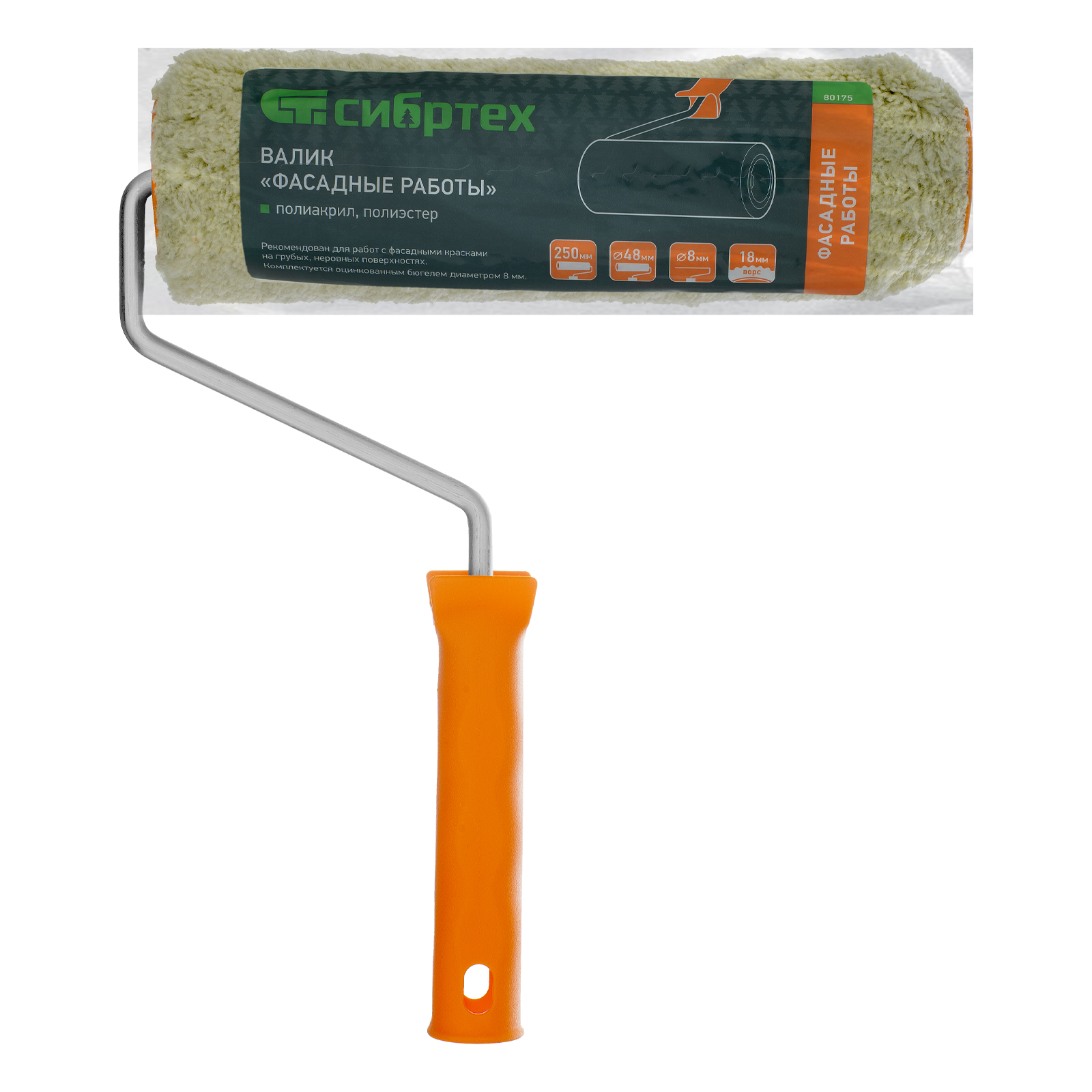 Валик Сибртех «Фасадные работы» 80175 с ворсом 18 мм из полиакрила и полиэстера, роликом 250 х 48 мм, ручкой 8 мм, рассчитан на наружные работы с фасадными красками. Валик эффективен для обработки поверхностей с грубой фактурой и неровностями. Полиакрил в составе шубки повышает ее формостойкость и устойчивость к разрывным нагрузкам.