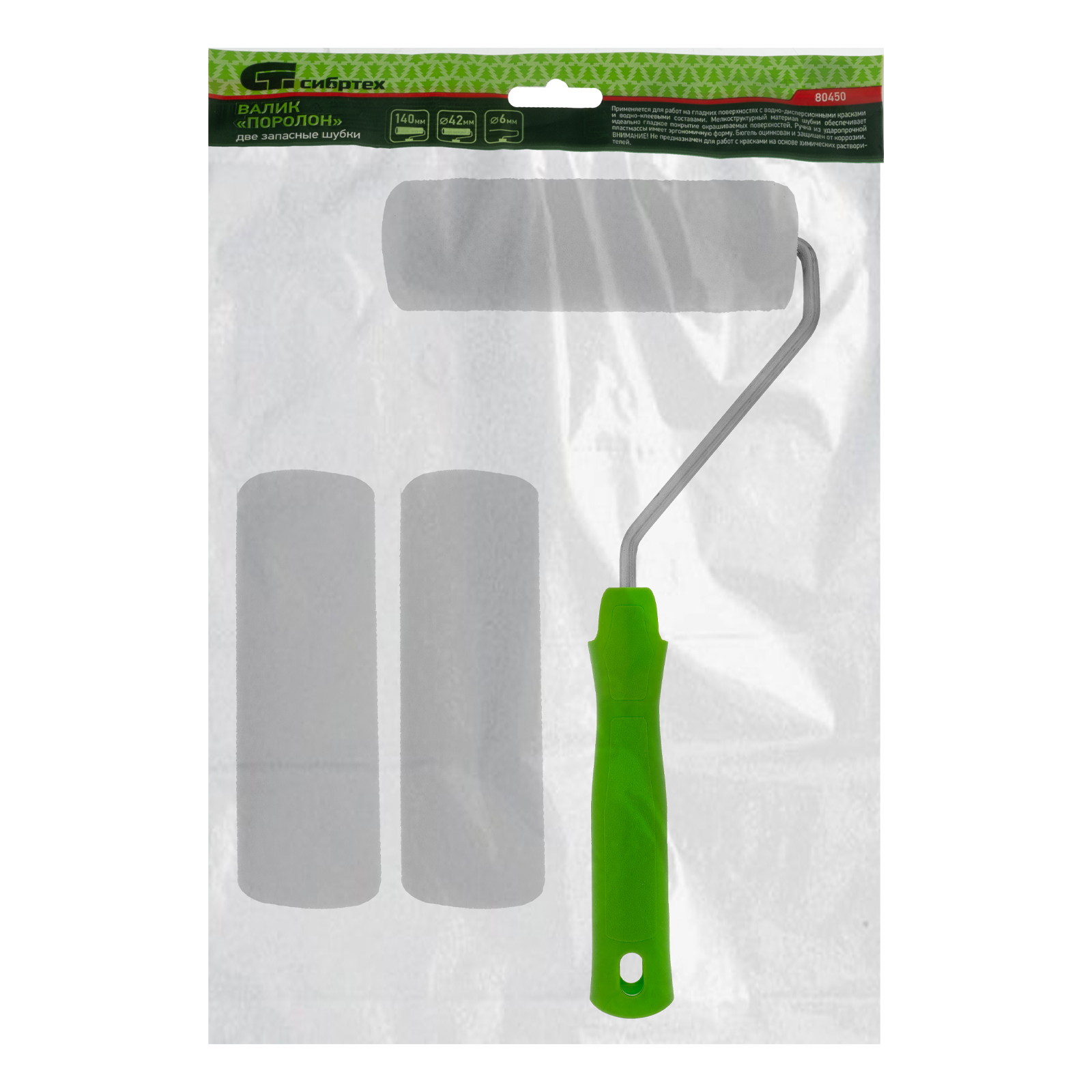 Набор Сибртех «Поролон» 80450 из валика диаметром 42 мм, шириной 140 мм, с ручкой диаметром 6 мм и двумя запасными шубками предназначен для окраски гладких поверхностей. Он применяется для нанесения водно-дисперсионных красок, побелки, лаков и клея на водной основе. Благодаря шубкам из поролона с мелкой структурой состав ложится на поверхность идеально ровным слоем.