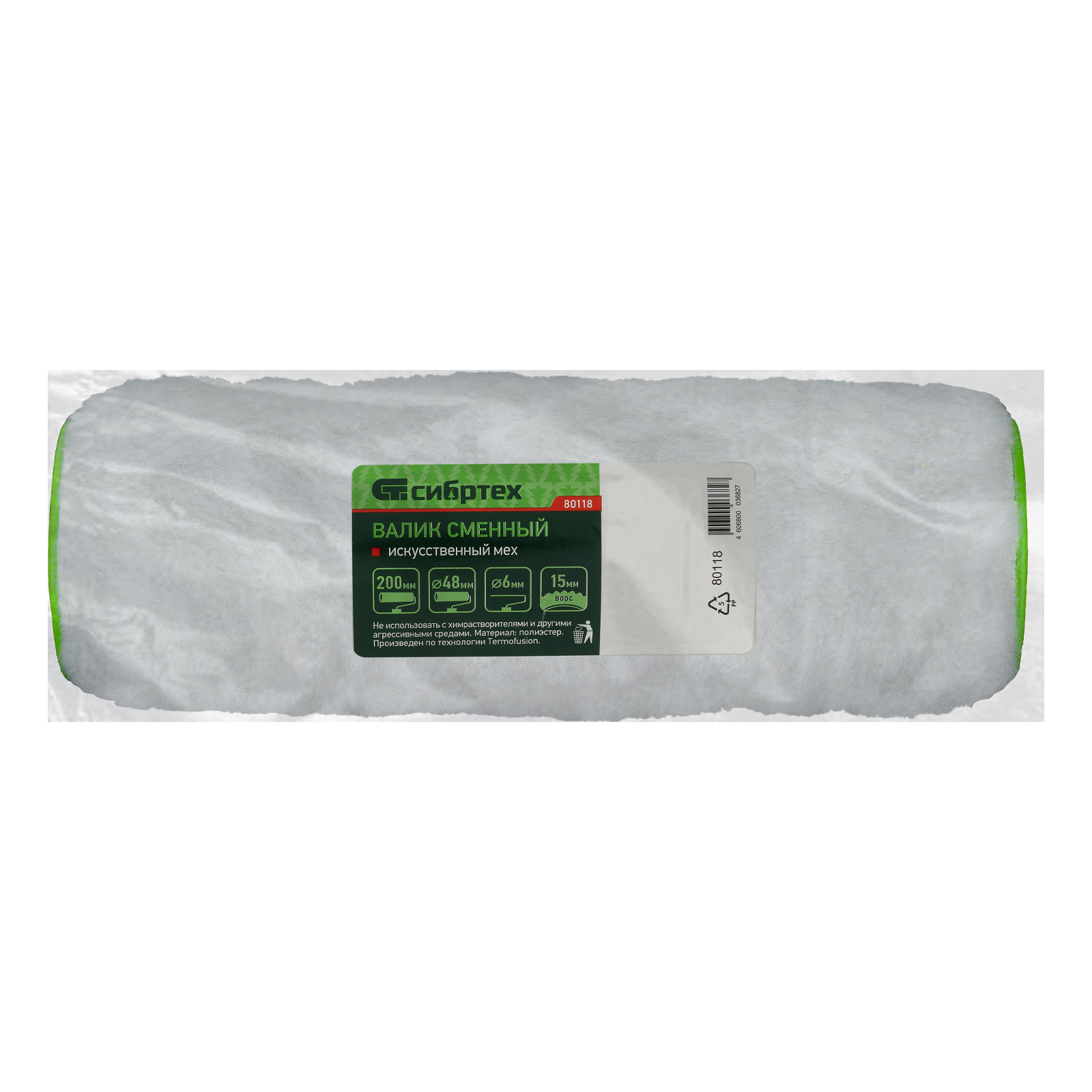 Сменный валик Сибртех «ИСКУССТВЕННЫЙ МЕХ» 80118 с ворсом из полиэстера 15 мм, шириной 200 мм и диаметром 48 мм, устанавливается на ручки диаметром 6 мм. Применяется для нанесения эмалей, масляных красок и защитных покрытий при проведении подготовительных и общих малярных работ. Ворс длиной 15 мм идеально подходит для окрашивания средне-гладких и шероховатых поверхностей. Изделие совместимо с валиком Сибртех 80113 и другими моделями аналогичного размера.