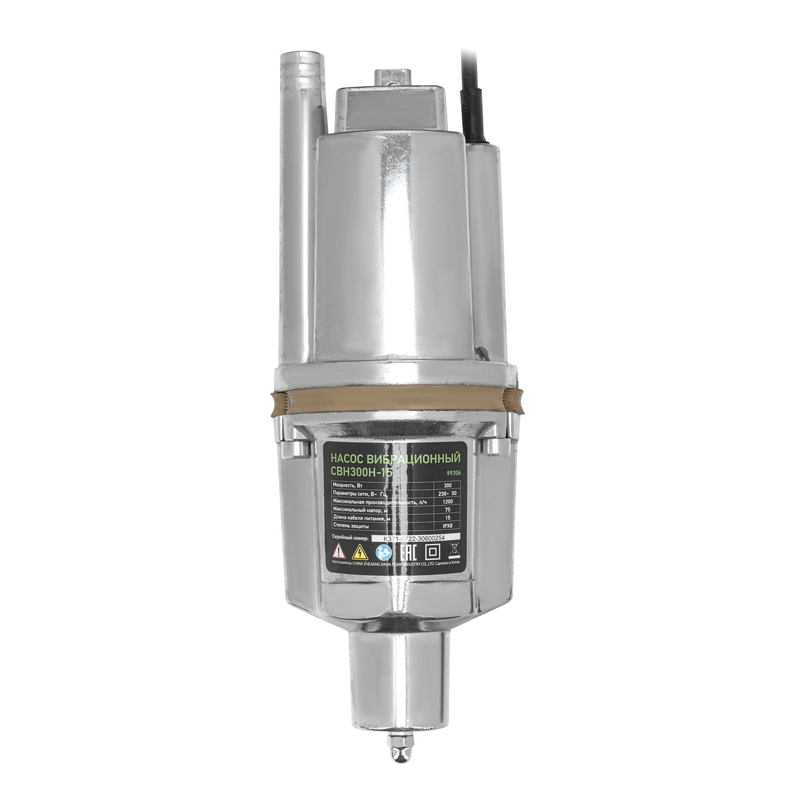 Вибрационный насос СВН300Н-15, нижний забор, 300 Вт, напор 75 м, 1200 л/ч, кабель 15 м Сибртех