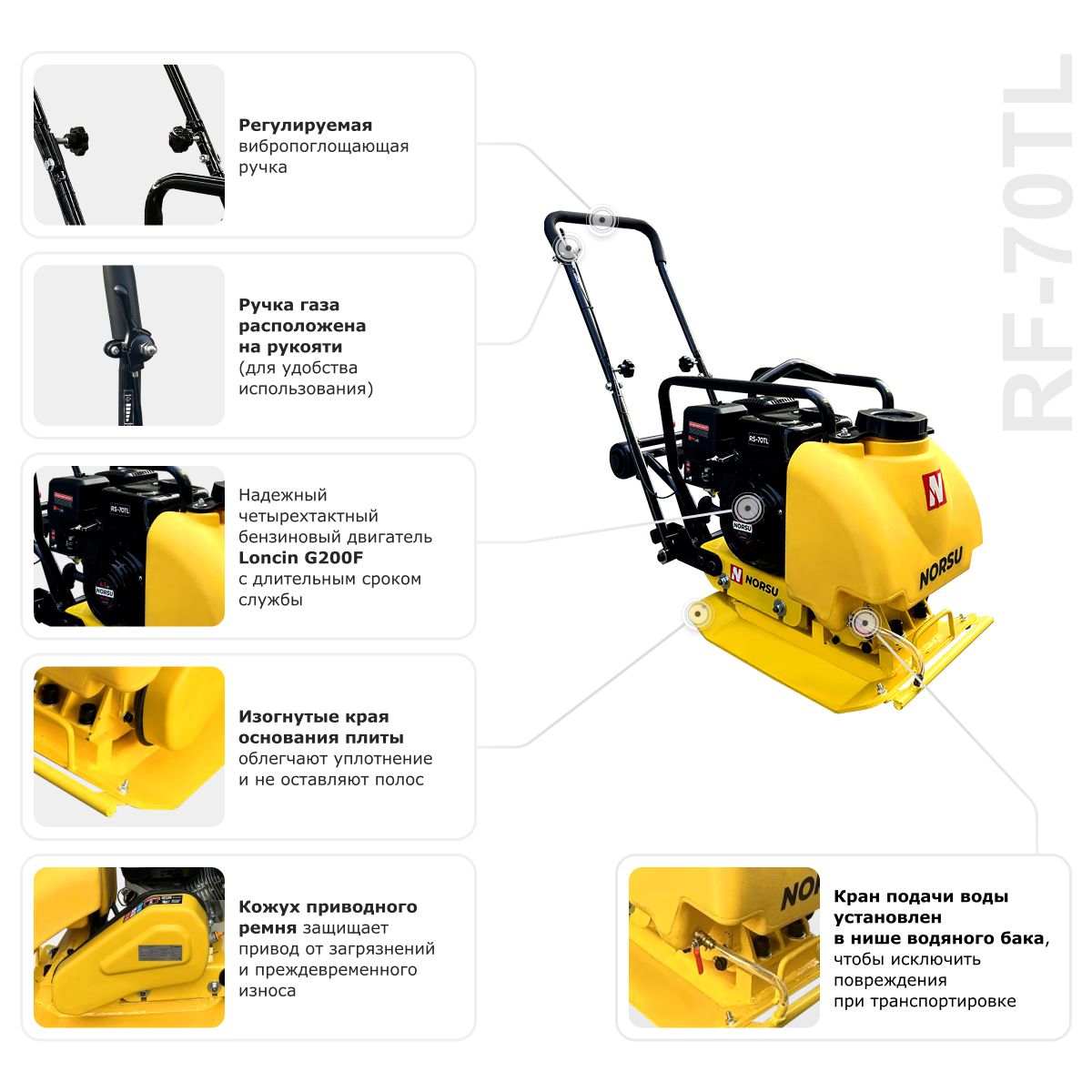 Виброплита бензиновая прямоходная NORSU RF-70TL (колесный комплект, бак для воды)