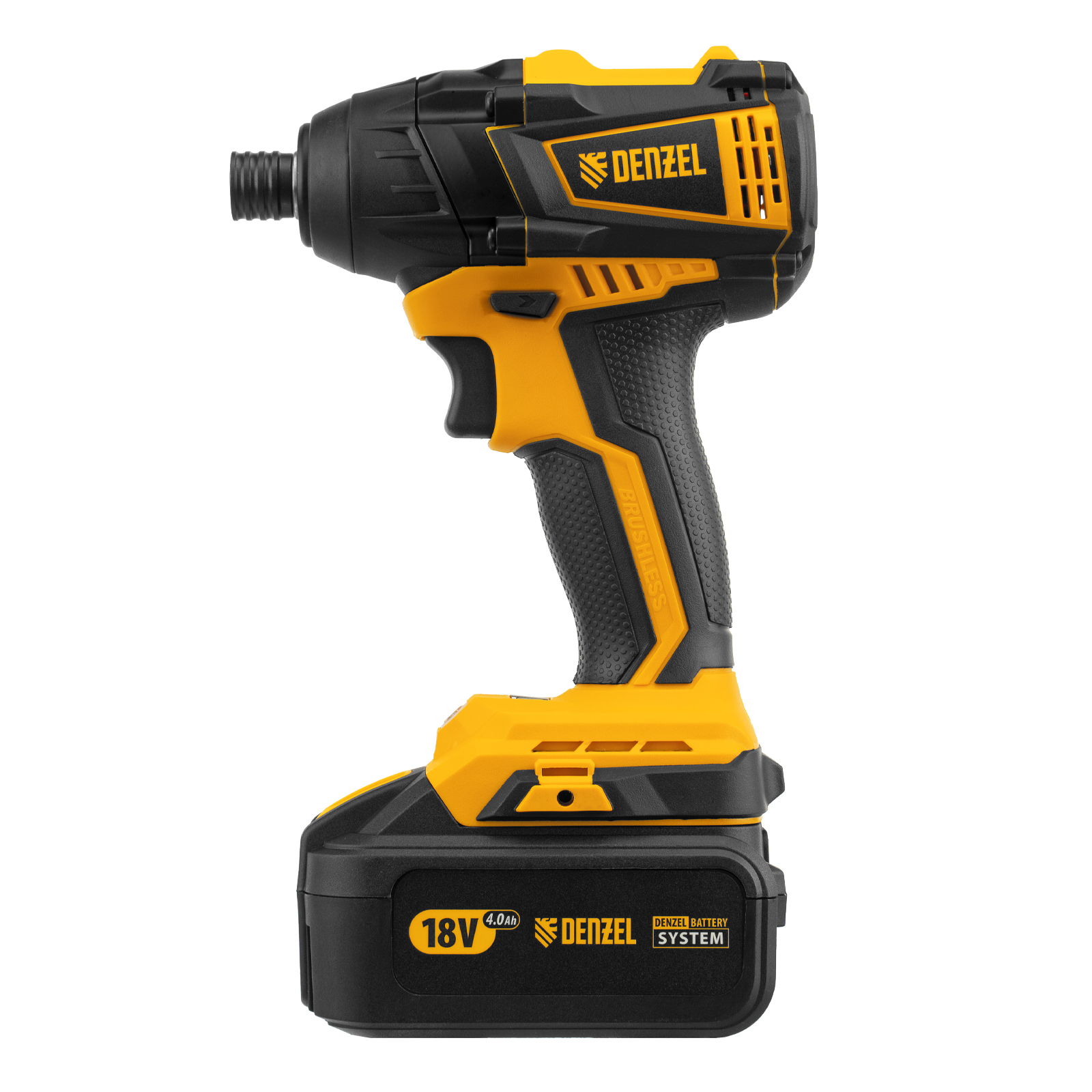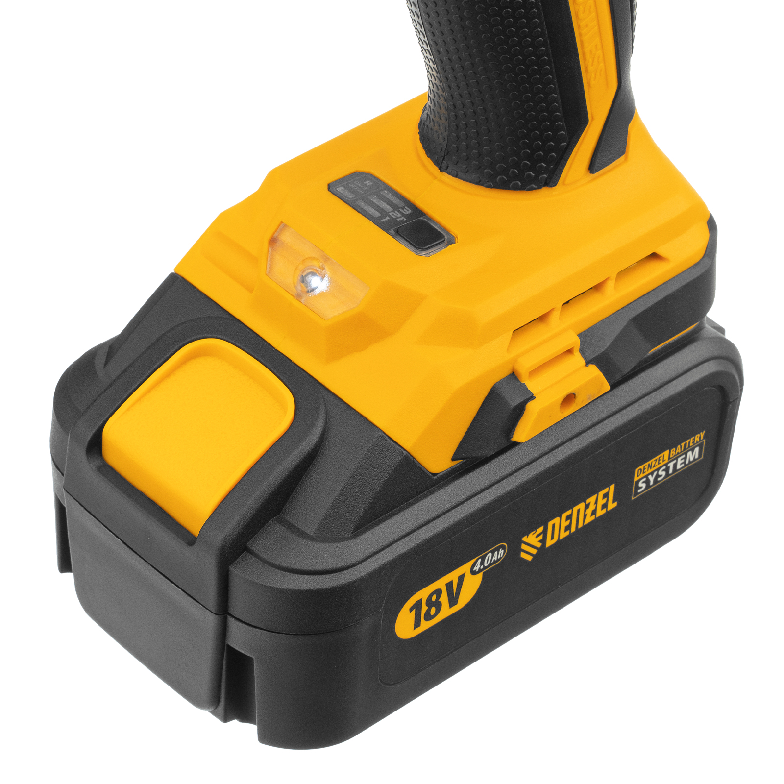 - Универсальность — к инструменту подойдут любые 18 В аккумуляторы Denzel battery system